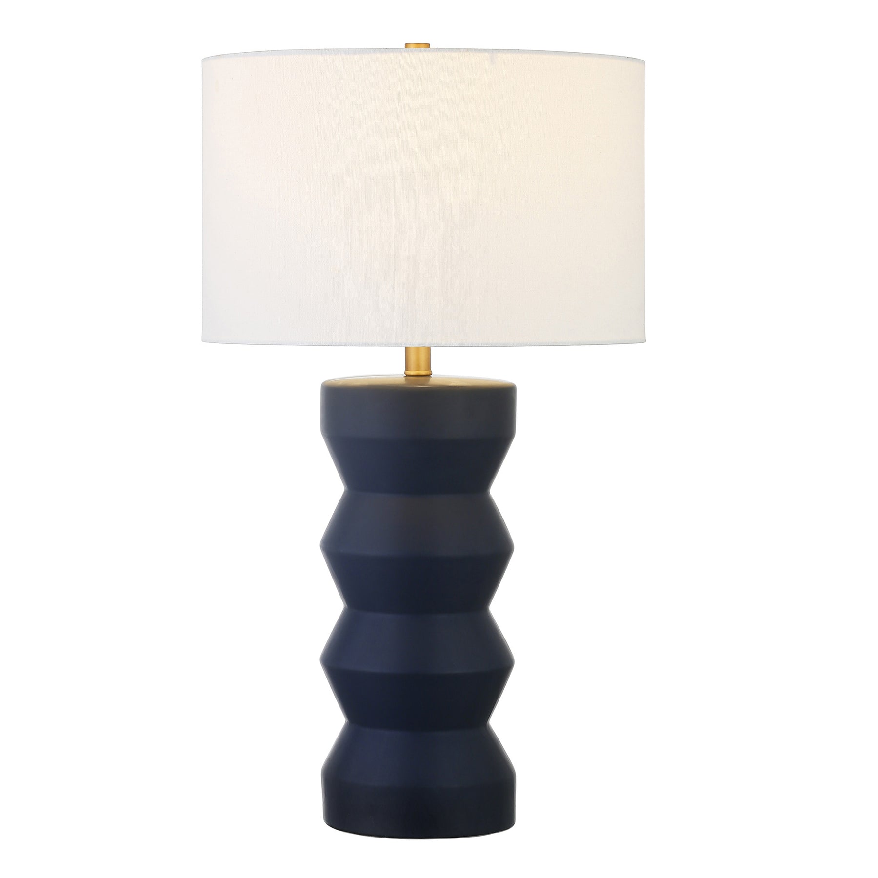 • Modern navy blue table lamp with a geometric ceramic base and white fabric shade.