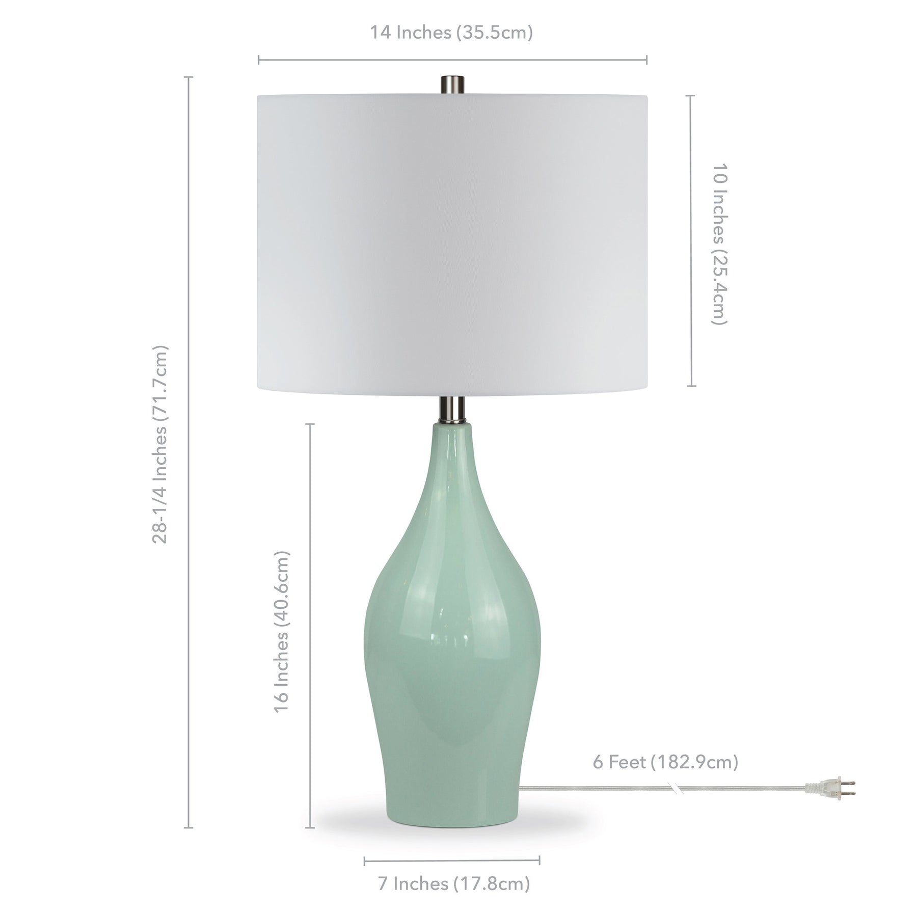 With this 28-inch teal blue porcelain table lamp with white drum shade you can bring in design to any space along with adding some ambient lighting. The lamp is made of sturdy porcelain and features a teal blue color. The white drum fabric shade is finishes this piece off nicely and symmetrically this standard table lamp is designed to provide general lighting to the area. Use this lamp anywhere and elevate the look of the whole space. Bring some lite and good vibes into your space with this updated and stylishly designed lamp. 28-inch H x 14-inch W x 14-inch D