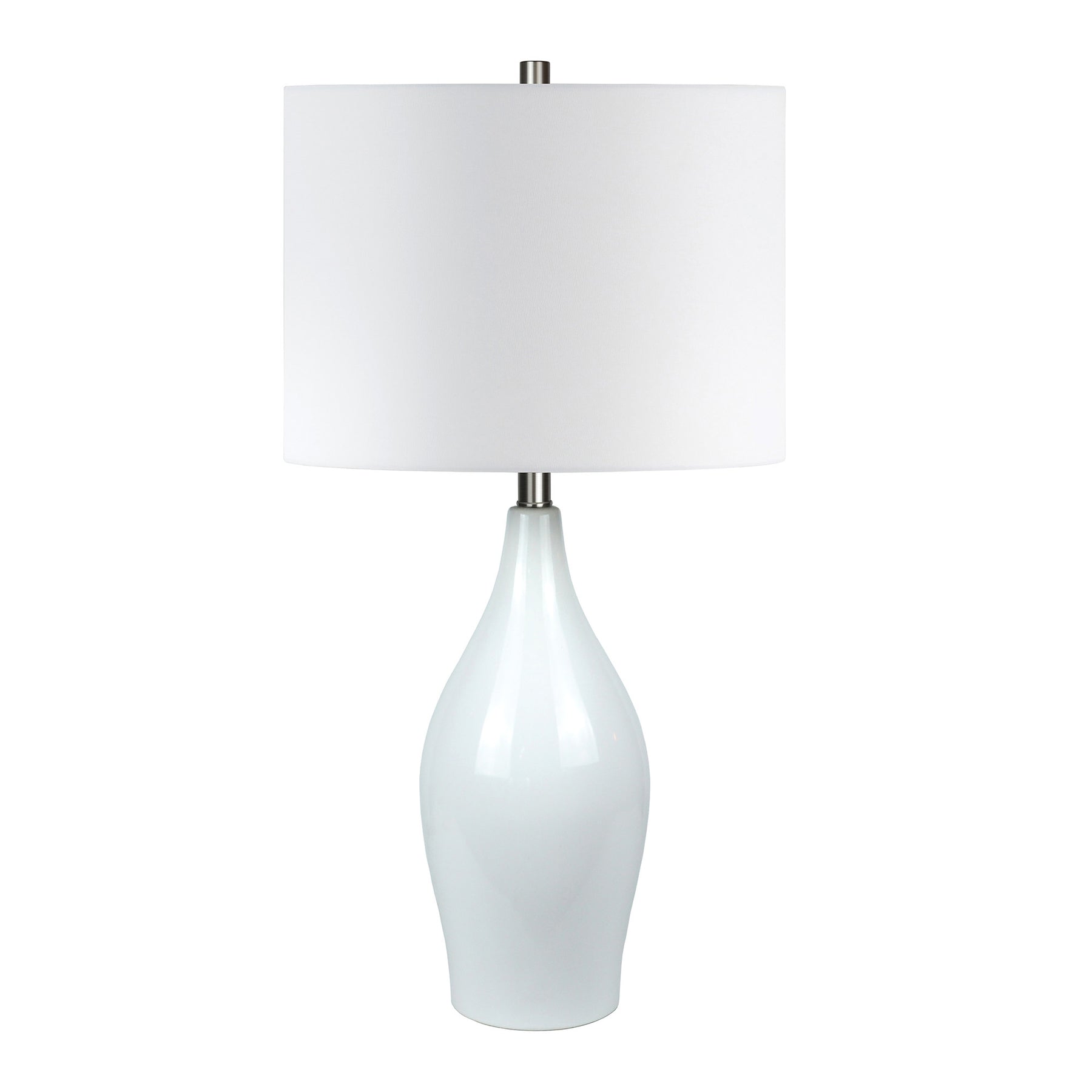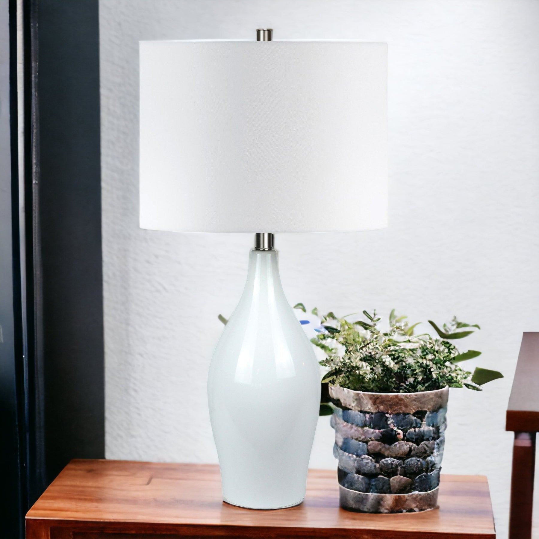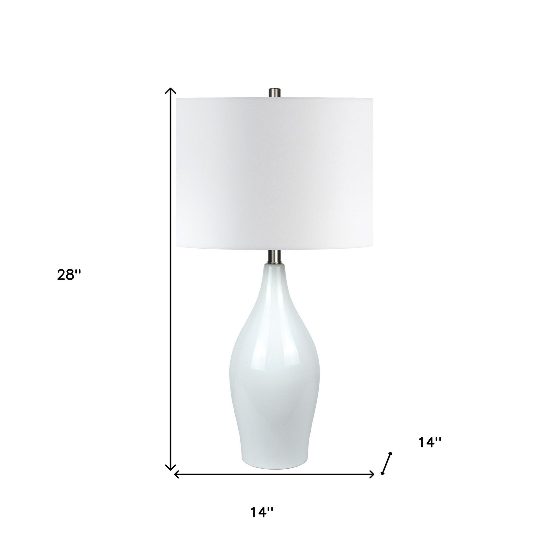 Bring of level of elegance and freshness to your space with this high quality 28-inch white porcelain table lamp with white drum shade. The base of this lamp is made of white porcelain. The white drum fabric shade is a great compliment to this lamp. This standard table lamp is designed to provide general lighting to the area. High quality design makes this a great lamp for not only lighting, but accenting a room with style. It is perfect for virtually any decor. 28-inch H x 14-inch W x 14-inch D