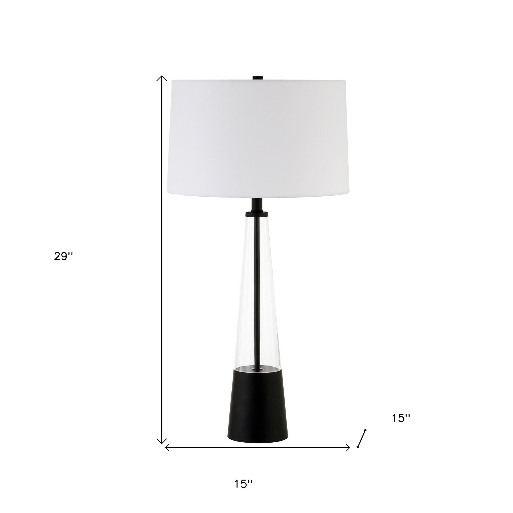 With this 29" black glass table lamp with white drum shade you can bring in design to any space along with adding some ambient lighting. The base of this lamp is made of glass finished in a black tone. The white drum fabric shade is finishes this piece off nicely and symmetrically This standard table lamp is designed to provide general lighting to the area. High quality design makes this a great lamp for not only lighting, but accenting a room with style. It is perfect for virtually any decor. 29" H x 15" W x 15" D