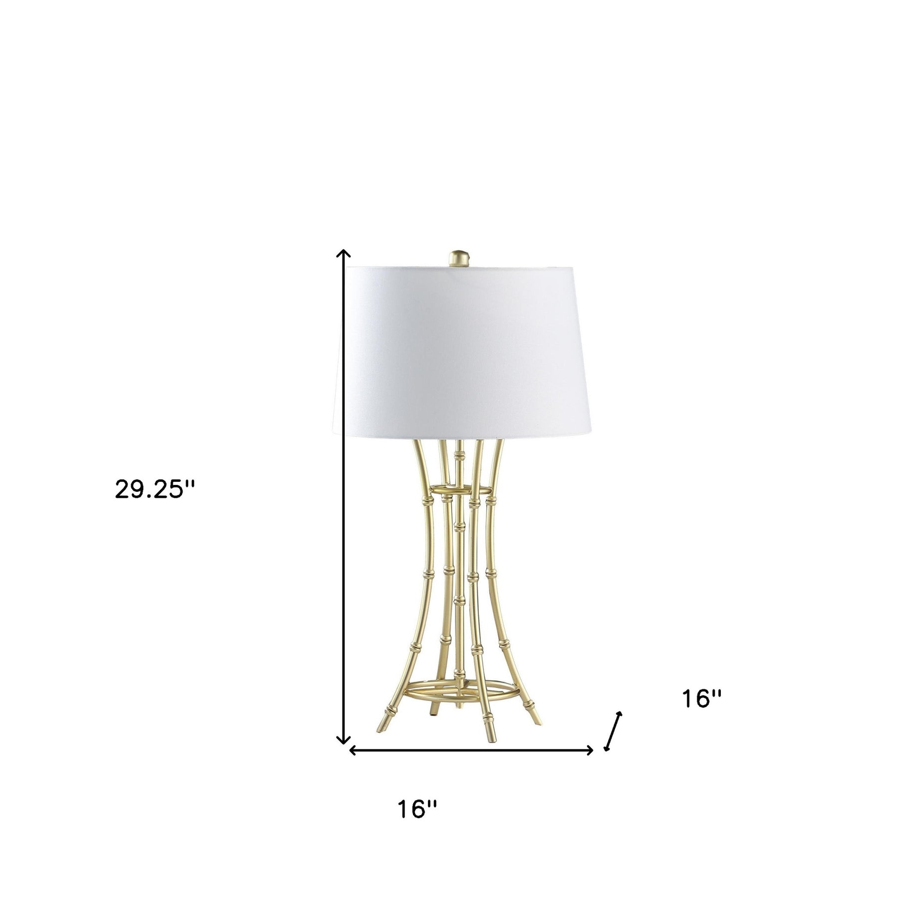 With this 29" gold metal table lamp with off white drum shade you can bring in design to any space along with adding some ambient lighting. The base of this lamp is finished in brushed gold metal and features rods that mimic bamboo, giving a slightly tropical and exotic vibe. The off white shade has a drum shape and is made of fabric, which makes it a perfect choice. This standard table lamp is designed to provide general lighting to the area. The light that this lamp throws is soft and warm to elevate the look of most any space in your home. The perfect lamp to create just the right natural and soothing light in your space. 29.25" H x 16" W x 16" D
