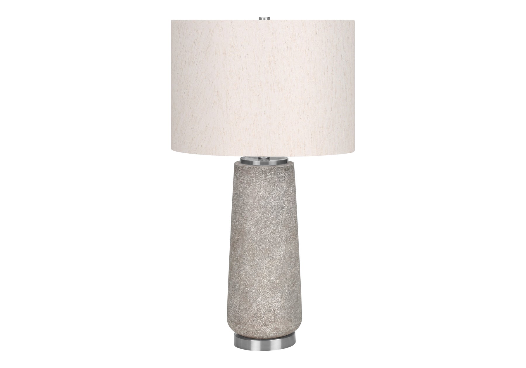 Bring of level of elegance and freshness to your space with this high quality 29-inch gray and silver cylinder table lamp with ivory drum shade. The lamp is made of sturdy resin and features a gray and silver color. Includes a ivory linen, drum shaped shade, making this a fashionable piece that will complement most any interior. This standard table lamp is designed to provide general lighting to the area. The light that this lamp throws is soft and warm to elevate the look of most any space in your home. Bring some lite and good vibes into your space with this updated and stylishly designed lamp. 29-inch H x 16-inch W x 16-inch D