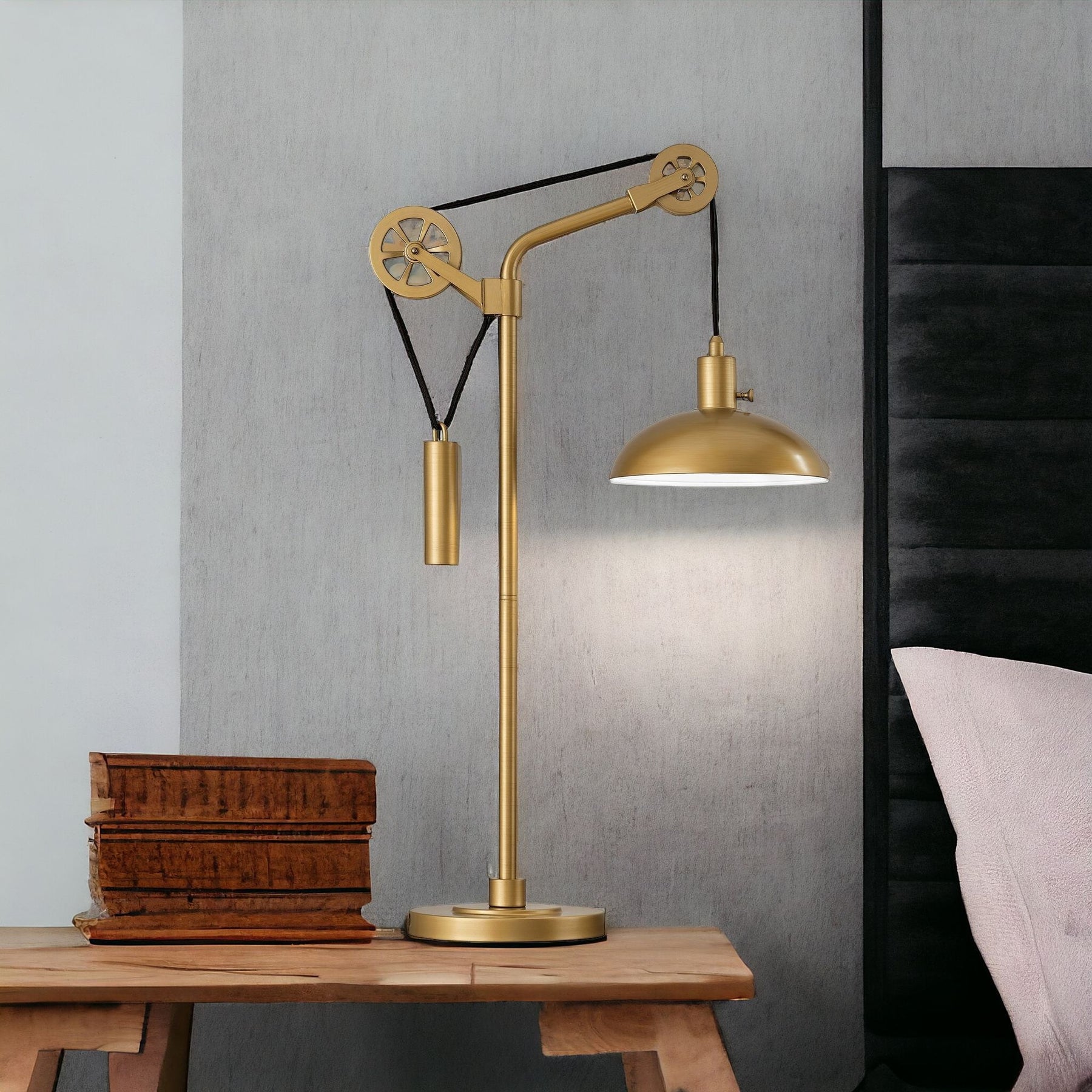 Add a bright anchor to your room with this 34-inch brass metal adjustable novelty desk table lamp with brass dome shade. The base of this lamp is made of metal finished in a brass tone. The brass shade has a dome shape and is made from metal. This desk lamp provides 'task lighting' that will illuminate your working area for reading or writing. The light that this lamp throws is soft and warm to elevate the look of most any space in your home. The perfect lamp to create just the right natural and soothing light in your space. 33.5-inch H x 16-inch W x 9-inch D
