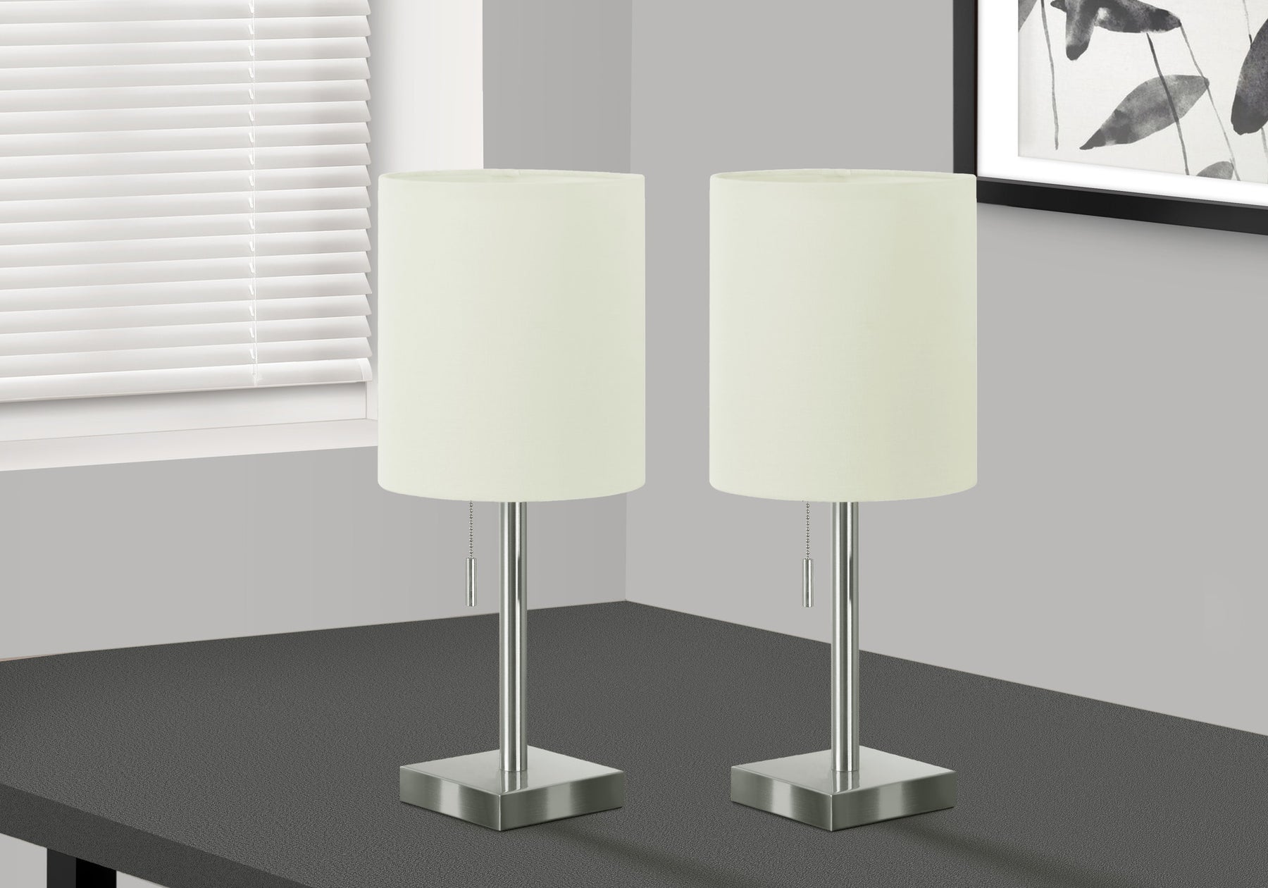Add a bright anchor to your room with this set of two 17-inch silver metal candlestick usb table lamp with ivory drum shade. The lamp is made of sturdy metal and features a silver color. The ivory drum linen shade is a great compliment to this lamp. This standard table lamp is designed to provide general lighting to the area. High quality design makes this a great lamp for not only lighting, but accenting a room with style. Bring some lite and good vibes into your space with this updated and stylishly designed lamp. 16.75-inch H x 7-inch W x 7-inch D
