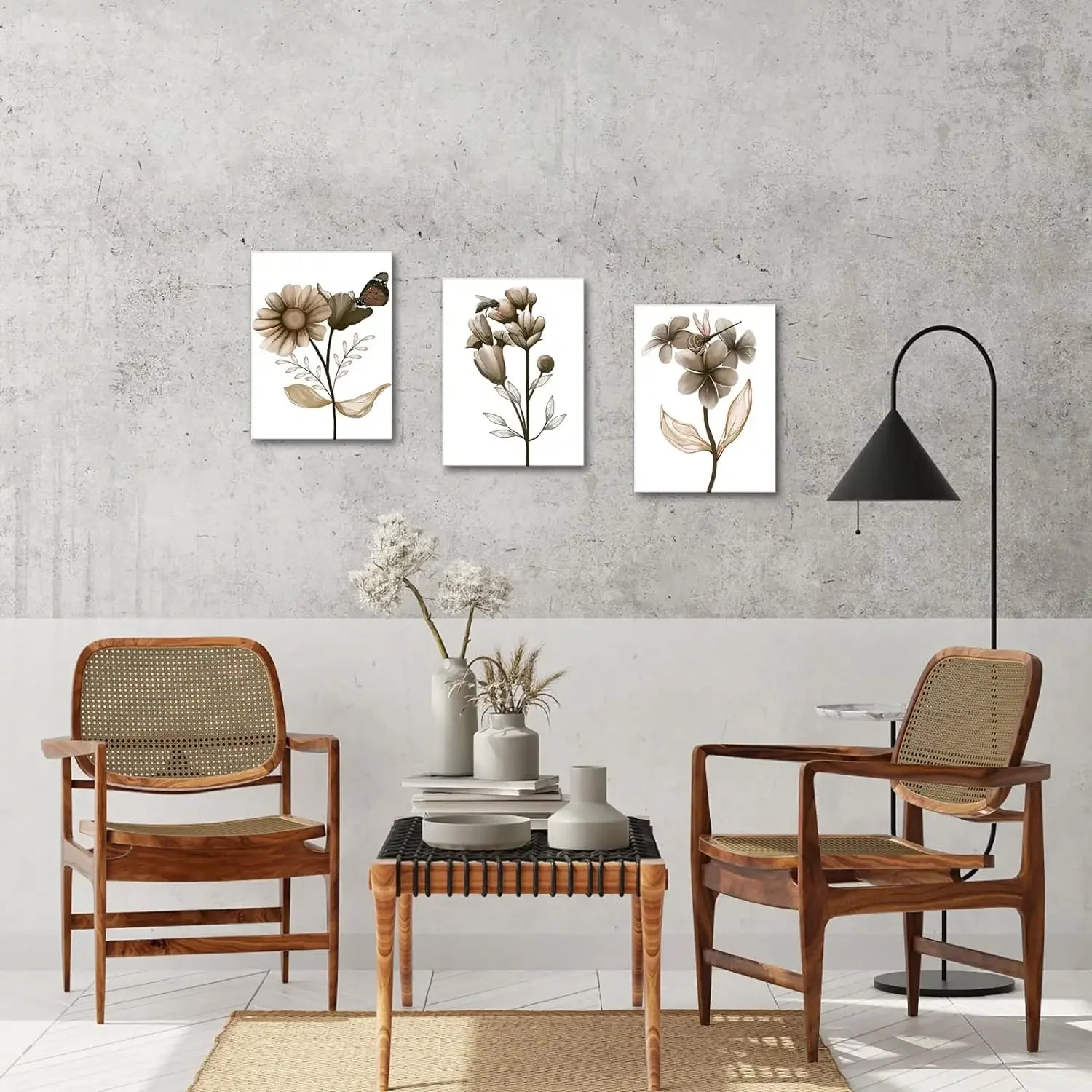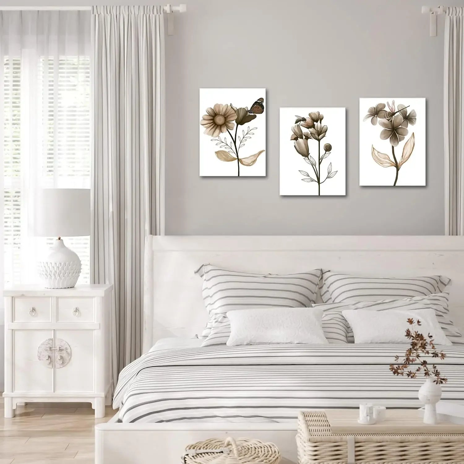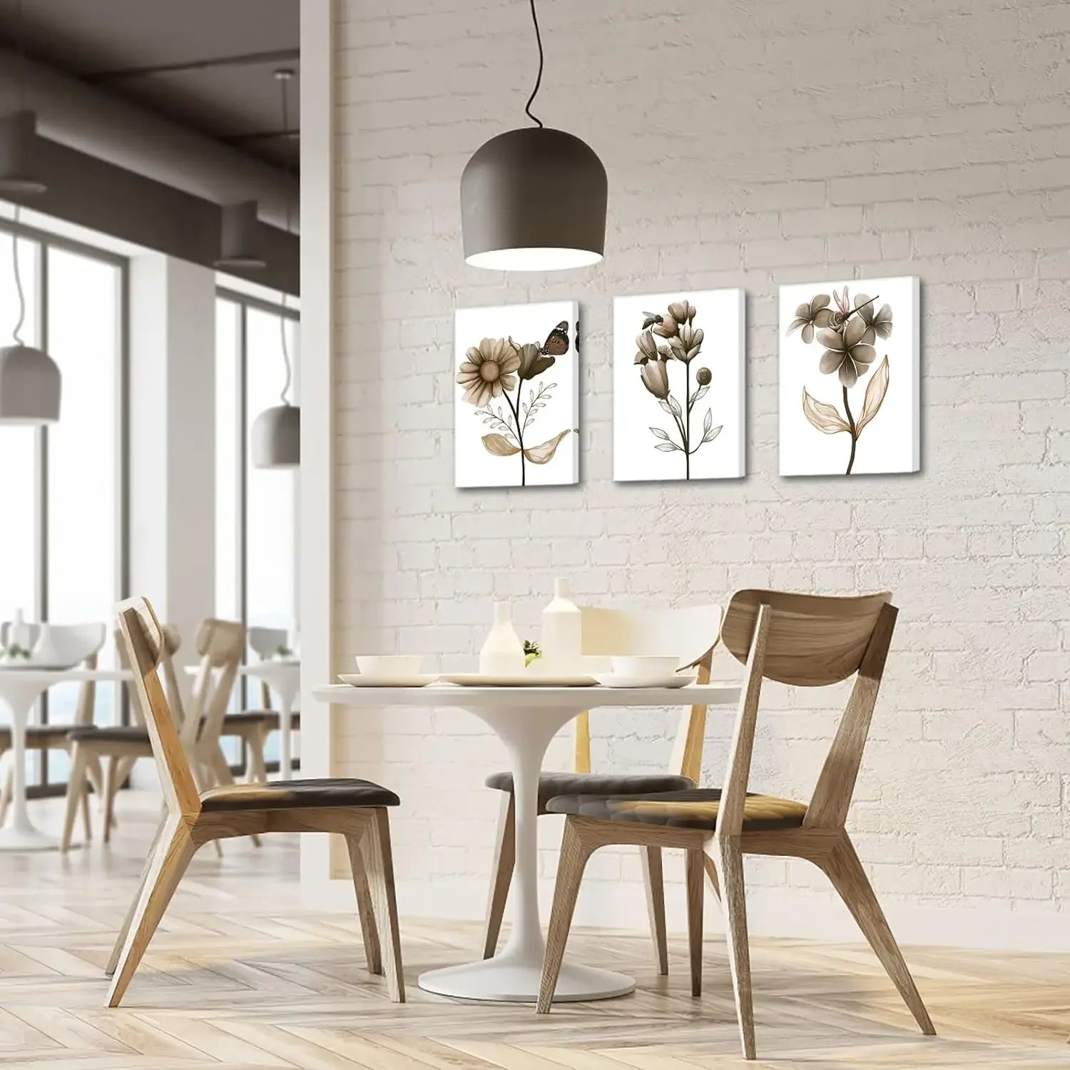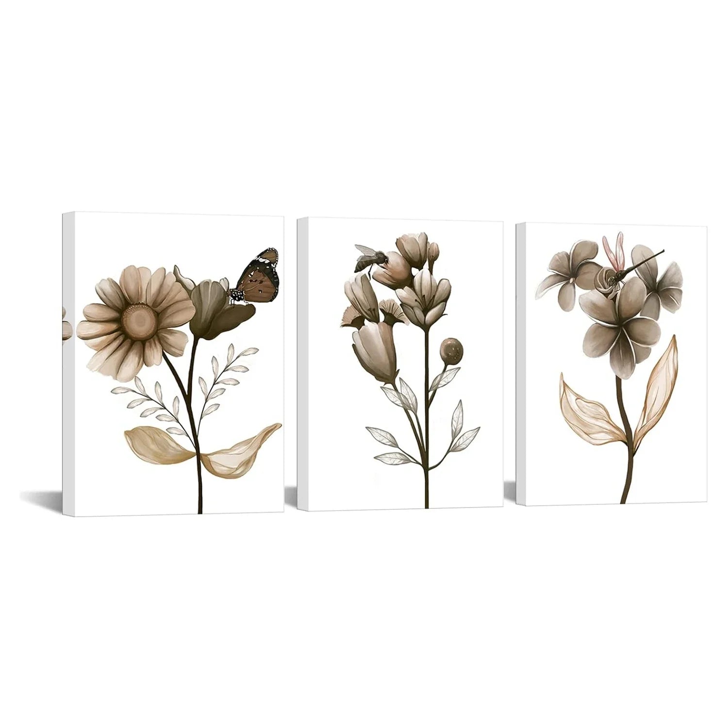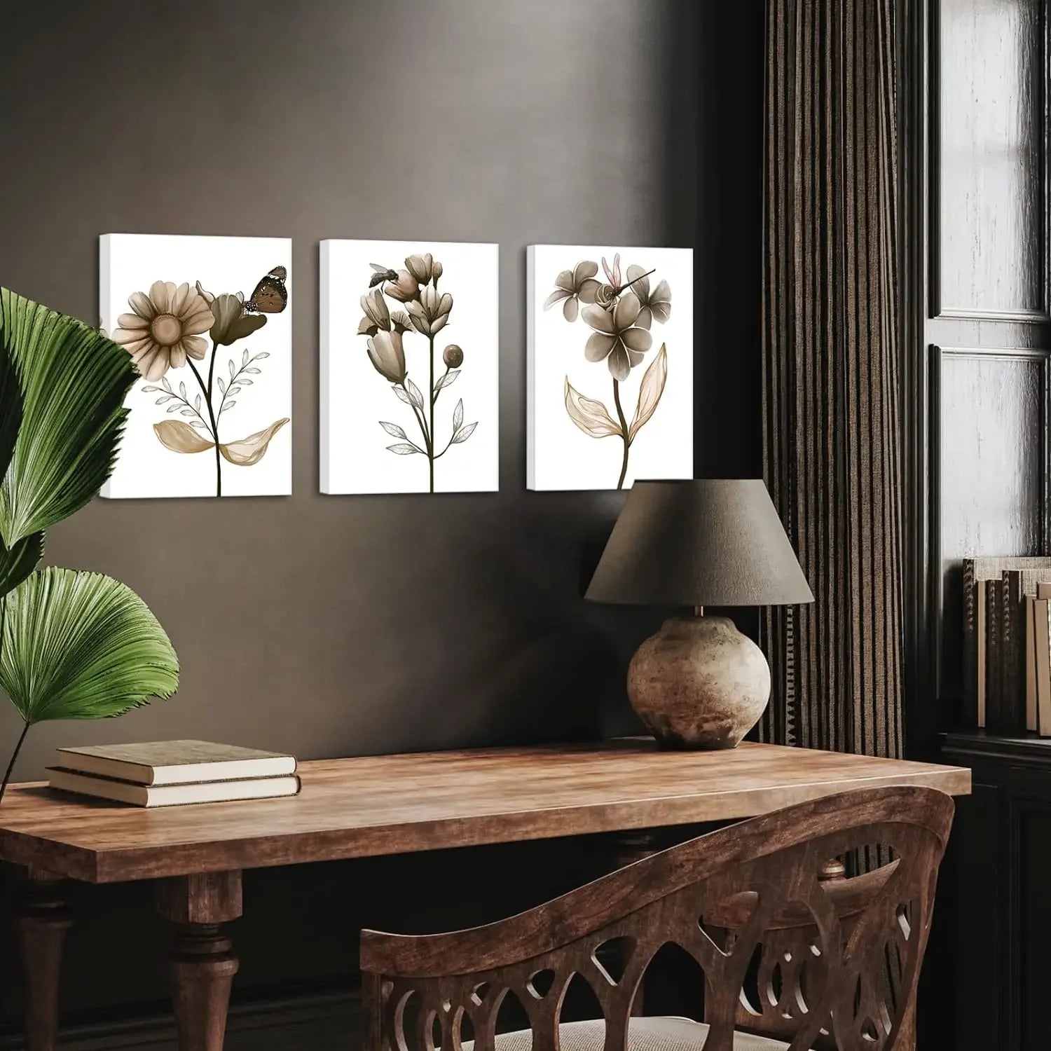 Enhance your home decor with this elegant 3-piece set of flower canvas wall art. Each piece features a charming brown flower painting art print, complemented by transparent flowers and a butter-colored frame. The combination of artistic prints and modern framing adds a touch of sophistication to any room. Ideal for living rooms, bedrooms, or office spaces, this set provides a stylish and cohesive look, effortlessly blending into various decor styles.