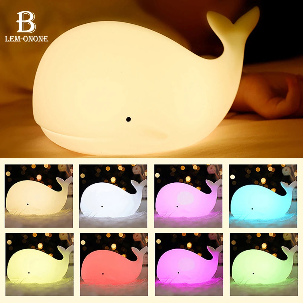 Bring a splash of fun to your child's room with the LED Cartoon Whale Night Light. This whimsical silicone lamp features a playful whale design and vibrant RGB lighting, creating a magical atmosphere with customizable color options. Rechargeable via USB for easy use, this night light offers soothing illumination perfect for bedtime or as a gentle night-time companion. Ideal for kids' bedrooms, nurseries, or as a delightful holiday gift, it combines charming aesthetics with practical functionality.