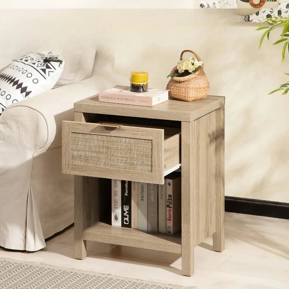 Elevate your bedroom decor with the Rattan Nightstand Bedside Table, a chic and functional piece that combines natural boho charm with practical storage. Featuring a drawer and an open storage shelf, this nightstand is perfect for keeping your essentials within reach while adding a touch of style to your space.