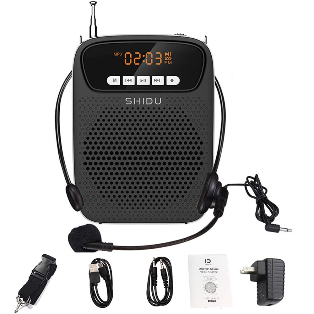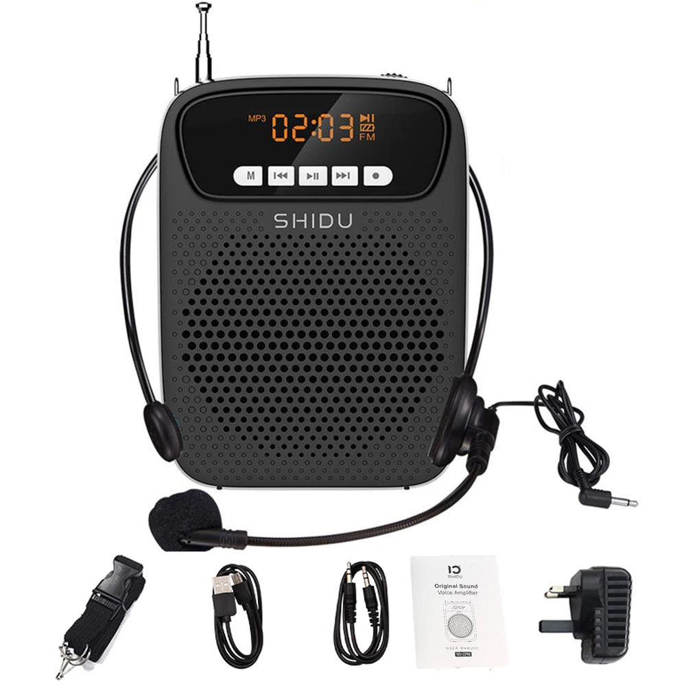 The SHIDU 15W Portable Voice Amplifier is a versatile and powerful tool designed for educators, instructors, and anyone needing to project their voice effectively. This all-in-one device features a built-in wired microphone, FM radio, AUX input, audio recording capabilities, and Bluetooth connectivity. With its robust 15W output, it ensures clear and loud amplification, making it perfect for classrooms, lectures, and presentations.