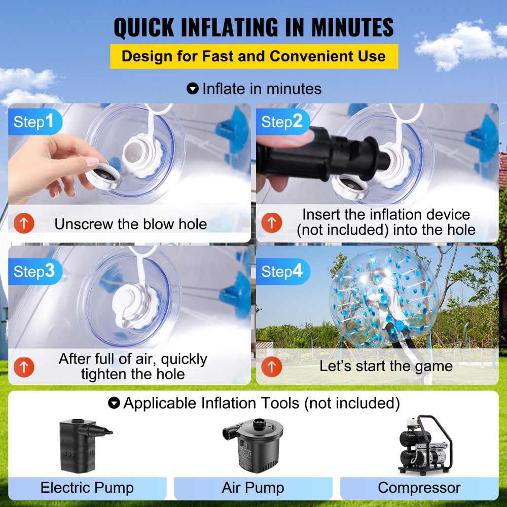 The VEVOR Inflatable Bumper Ball offers high-energy fun with a 5-foot (1.5-meter) diameter and eye-catching blue dot design. Built from durable PVC, this zorb ball inflates in just 5 minutes and is designed for exciting bubble soccer games and outdoor recreational activities. Perfect for both adults and children, it combines safety, comfort, and durability to ensure hours of active entertainment.