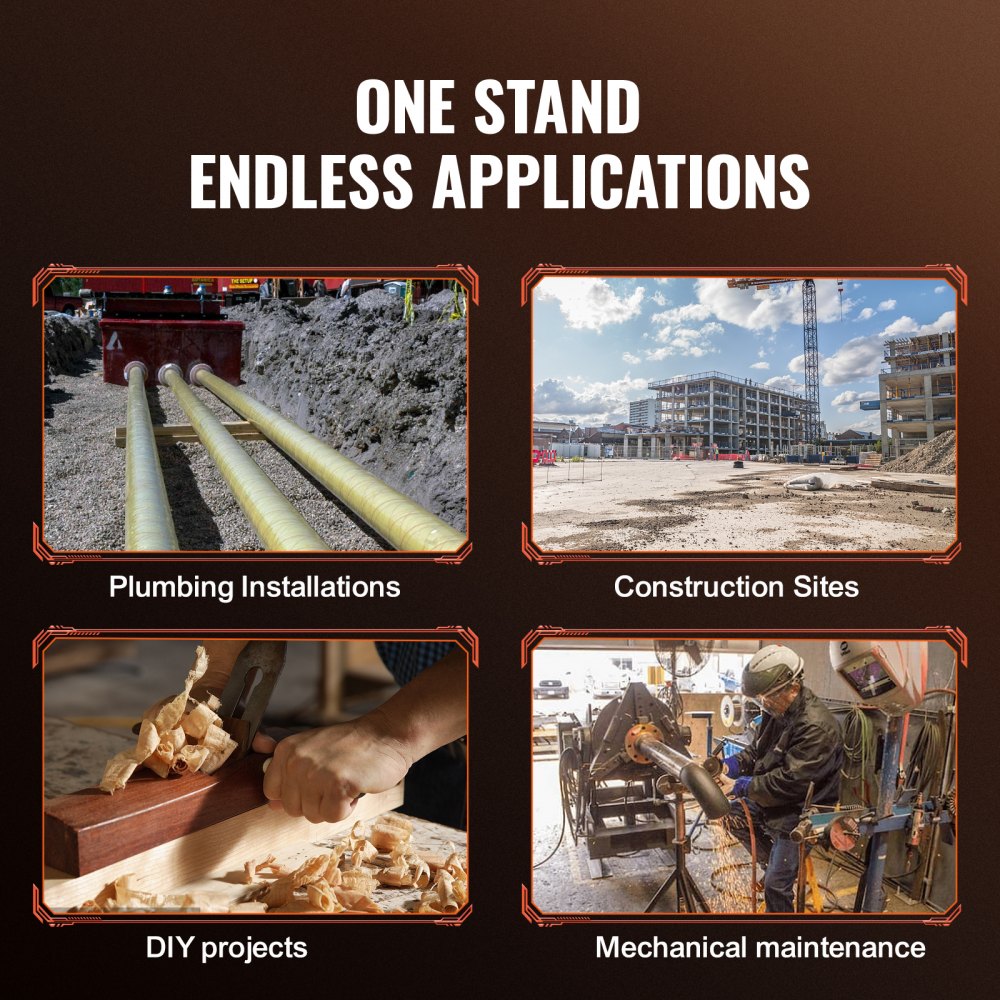 The VEVOR V Head Pipe Stand provides strong and reliable support for pipes ranging from 1/8" to 12" in diameter. With an adjustable height between 20" and 37", this stand can accommodate various working positions and pipe sizes. Made from durable carbon steel, it is both portable and foldable, ensuring easy transport and storage. Built to withstand loads up to 2500 lbs, it is an ideal tool for construction, plumbing, and industrial applications where stable pipe handling is essential.