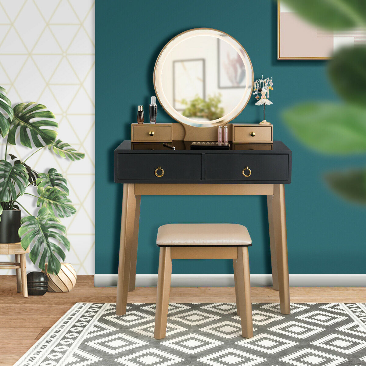 This stylish and functional vanity set is designed to elevate your dressing area while offering ample storage and a comfortable seating experience. The set includes a round mirror with adjustable LED lighting, perfect for providing natural light during makeup application. Featuring 4 drawers of varying sizes, this vanity provides plenty of space for your jewelry, accessories, and toiletries. Crafted with solid wood legs for durability and an elegant design, this set blends seamlessly into any room and serves as an ideal gift for loved ones.