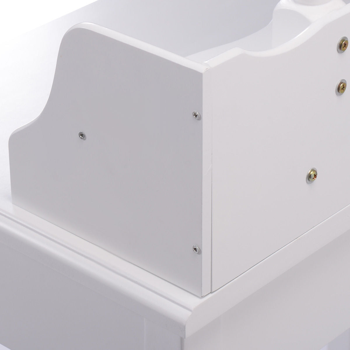 This elegant vanity makeup table and stool set is the perfect addition to any girl’s room. Crafted from high-quality MDF panels and solid pine wood legs, this set is built for durability and stability, offering both style and function for your beauty routine.