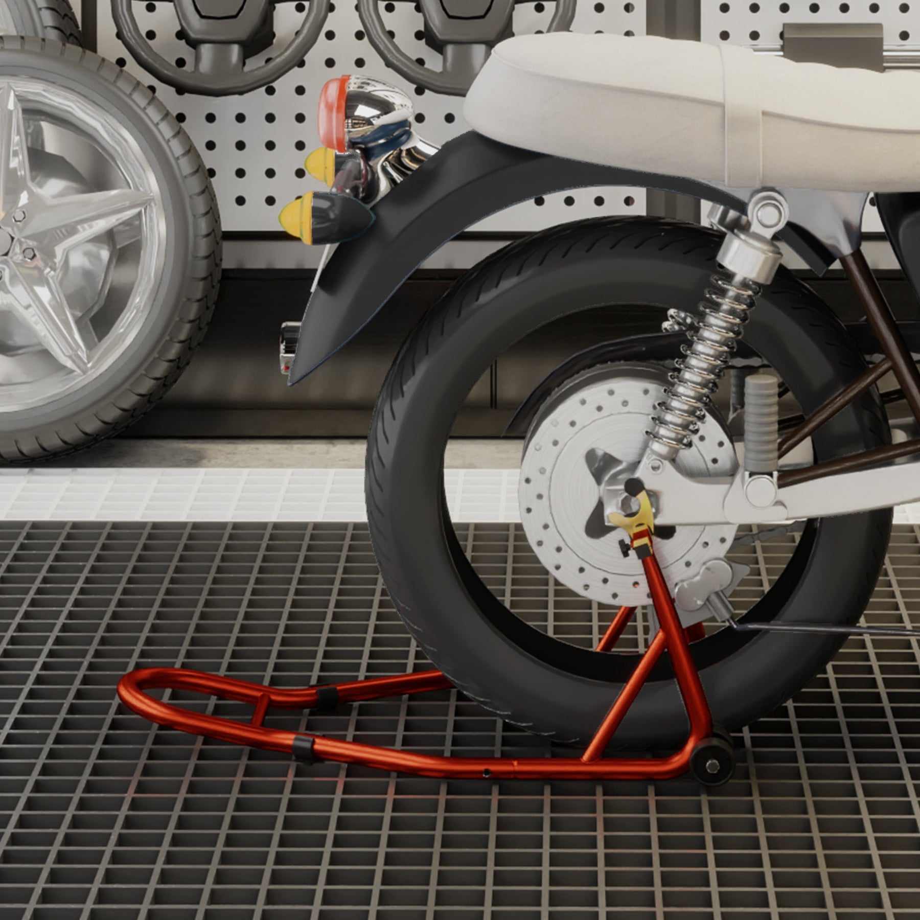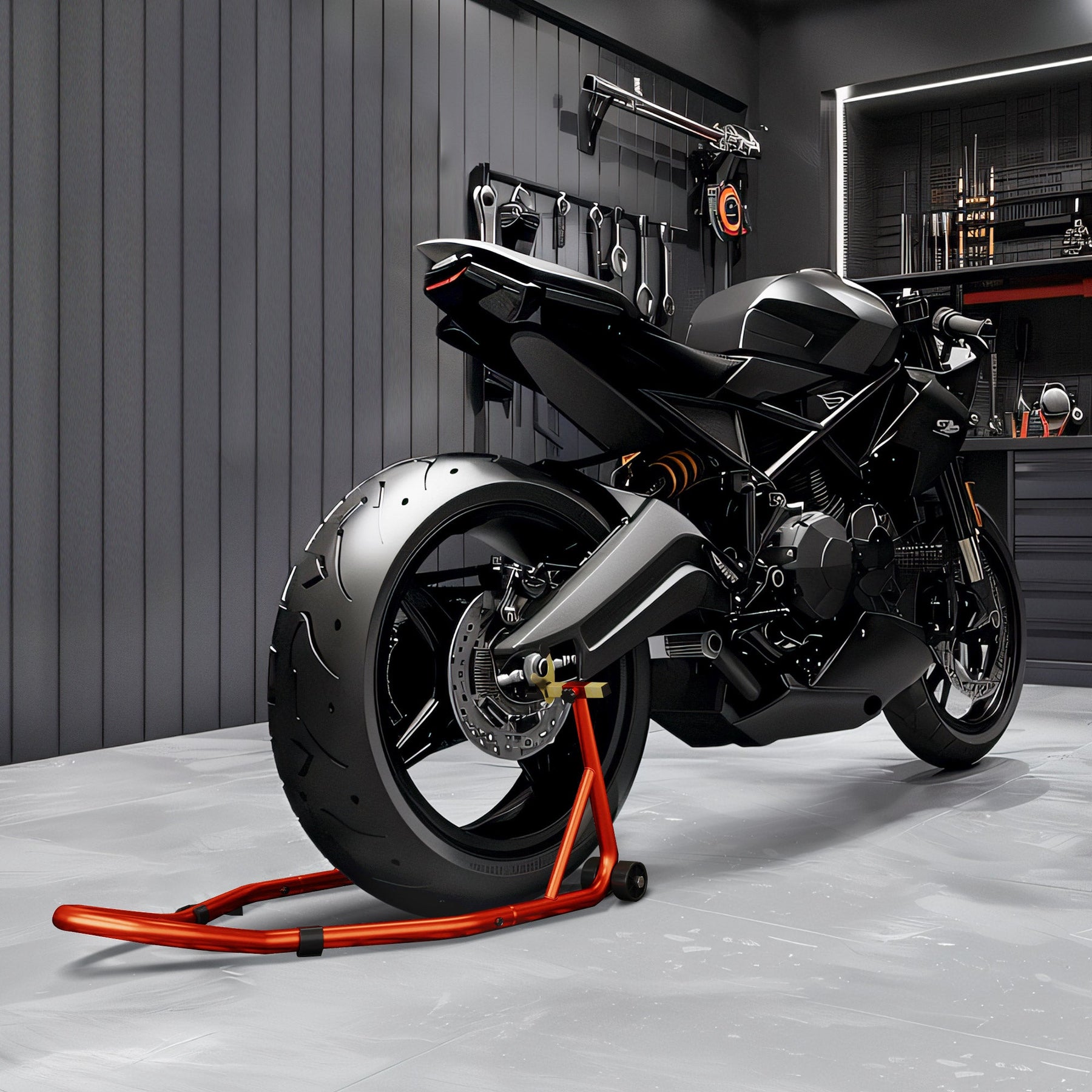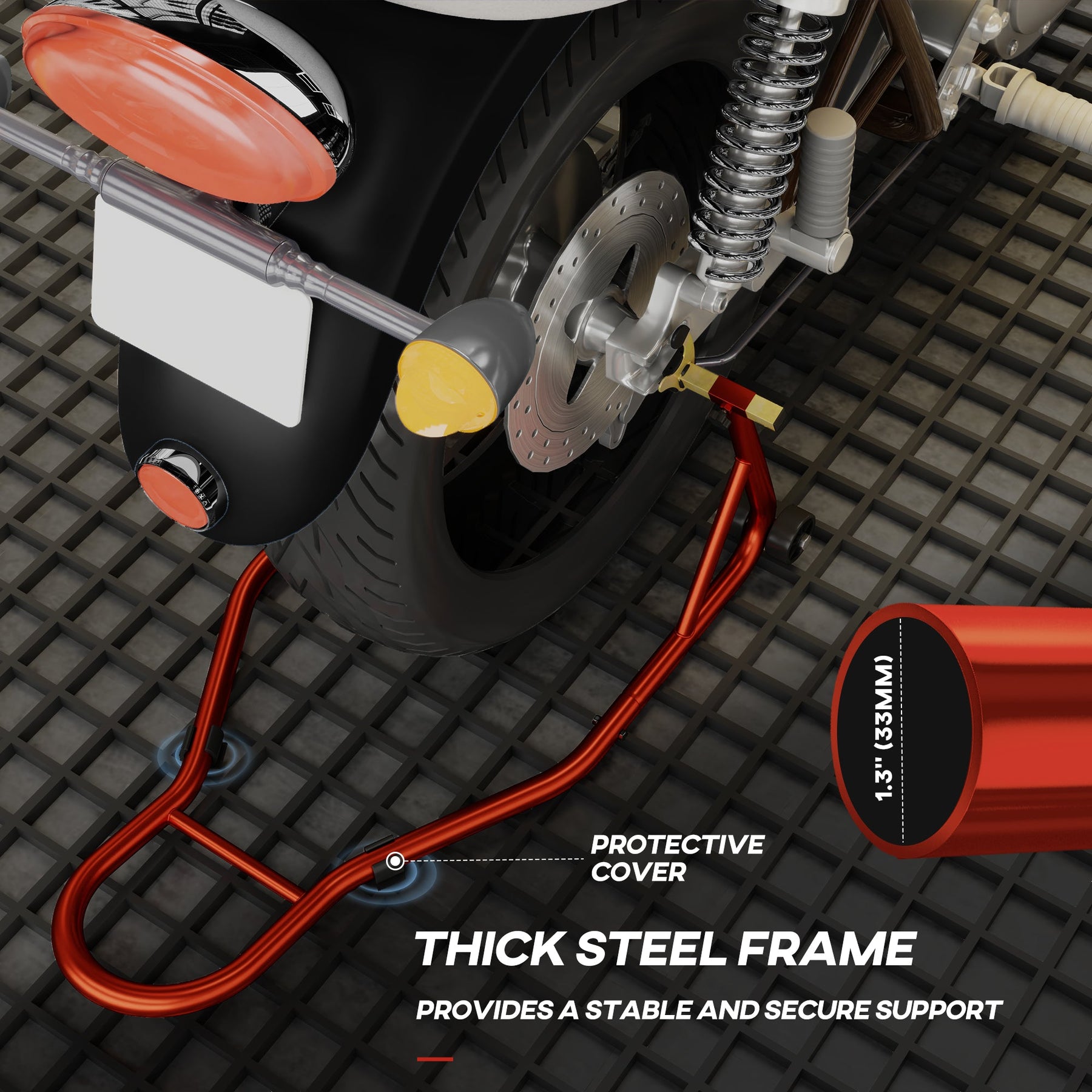 This versatile motorcycle stand is designed to accommodate a variety of tyre sizes, with hook and cradle cup adaptors making it suitable for tyres with diameters of 18", 17", and 10". Built from thick, powder-coated steel, the stand offers exceptional support and can safely hold up to 200kg (440 lbs), providing a strong and reliable foundation for motorcycle maintenance. The non-slip protective covers on the tubes prevent any slipping or scratching, ensuring your motorcycle stays securely in place during use. A wide handle is incorporated for ease of handling, allowing you to lift and lower your motorcycle comfortably and without strain. Easy to assemble, this motorcycle stand is a great addition to your garage or workshop.