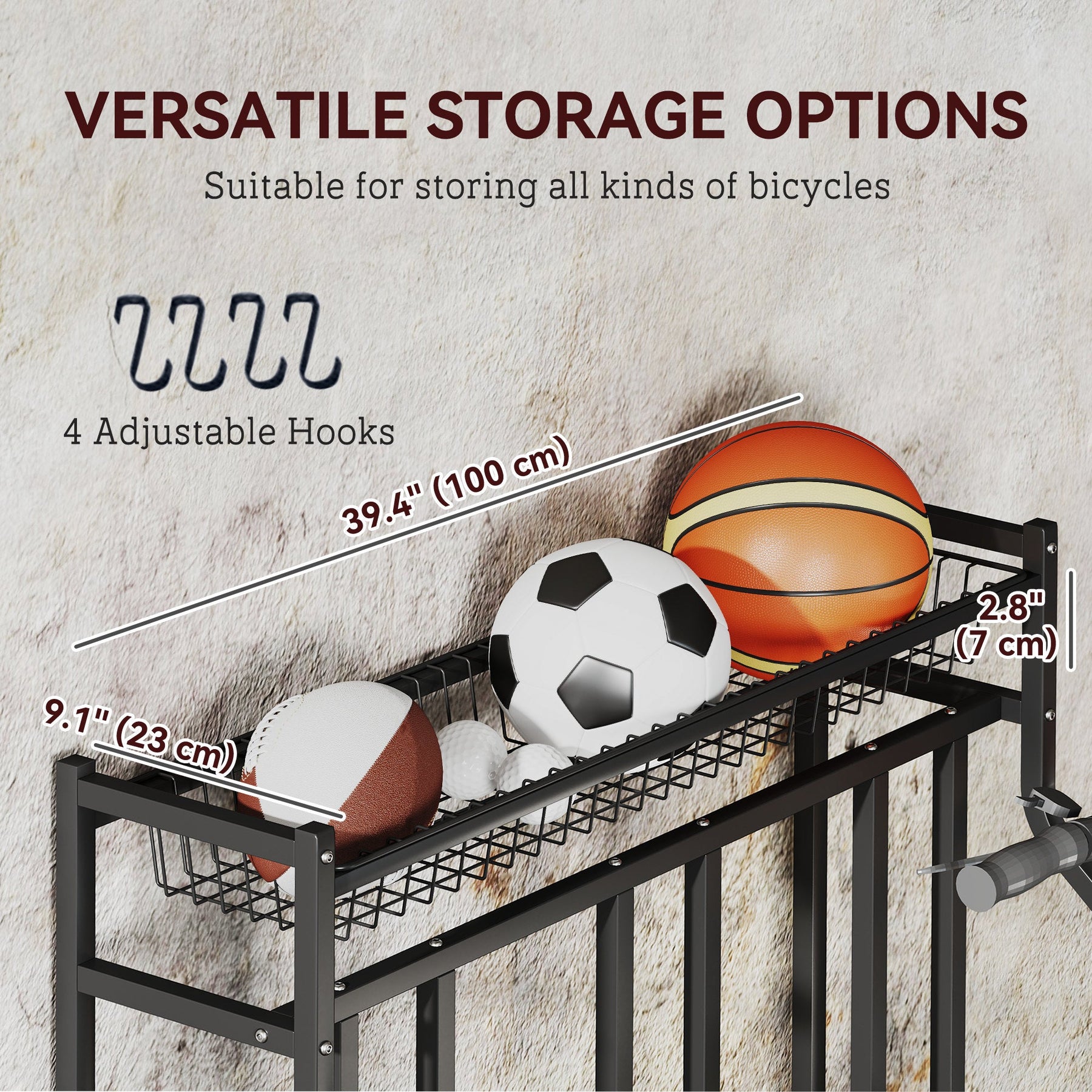 Keep your bicycles and sports gear organized with this 4-Slot Bike Storage Rack. Designed to hold up to 4 bikes with tire widths of up to 5.1" (13 cm), this versatile rack is perfect for a variety of bicycles, including road, mountain, hybrid, and kids' bikes. The built-in top basket offers convenient storage for sports equipment such as footballs, baseballs, gloves, and more. Additionally, the 4 adjustable S-hooks provide space for hanging helmets, goggles, tennis rackets, bags, and other accessories. Crafted from durable steel tubes, the bike stand is resistant to corrosion, rust, and weather, ensuring long-lasting durability. Its freestanding design allows for easy placement in tight garage spaces or outdoor areas, keeping your bikes and gear neatly organized and within easy reach.