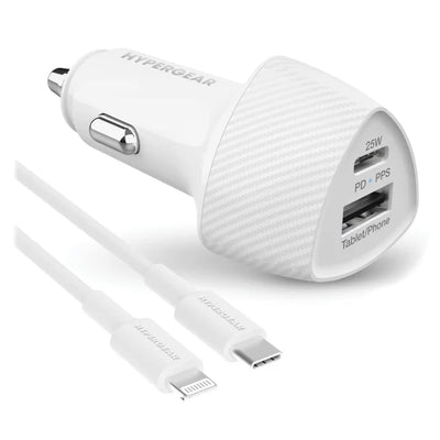 HyperGear® mini Dual 20-Watt USB-C® PD and 18-Watt USB Car Charger (White)