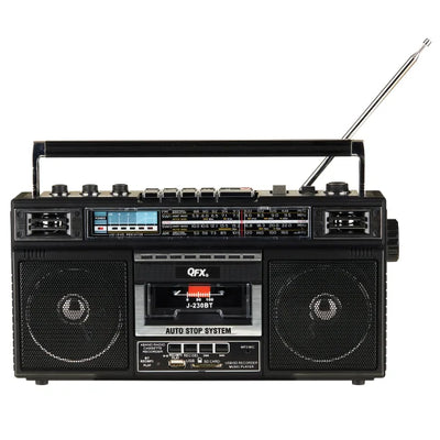 QFX® Bluetooth® Cassette USB/SD™ Card/AM/FM/SW1-2 Radio Boom Box with USB Recording and Built-in Microphone, Black, J-230BT