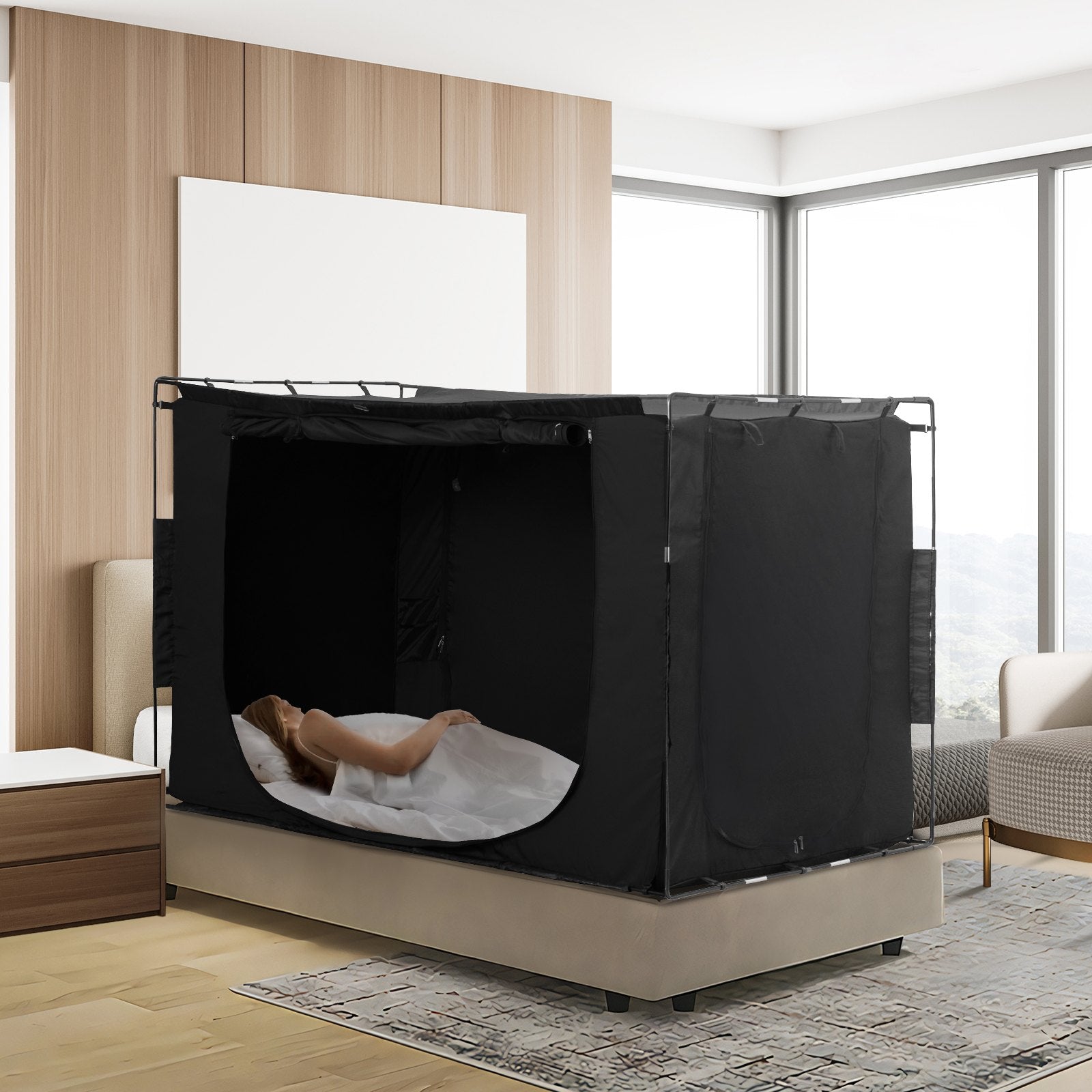 The VEVOR 3 Doors Bed Tent is designed to offer privacy and comfort with its spacious, breathable structure and effective light control. The tent features three mesh doors for easy access and ventilation, while the 70% blackout fabric ensures a dark, restful sleep environment. With its adjustable light control and quick setup process, this bed tent is perfect for creating a peaceful, private sleeping area. Whether for home use or camping, it offers a versatile solution for a comfortable rest.