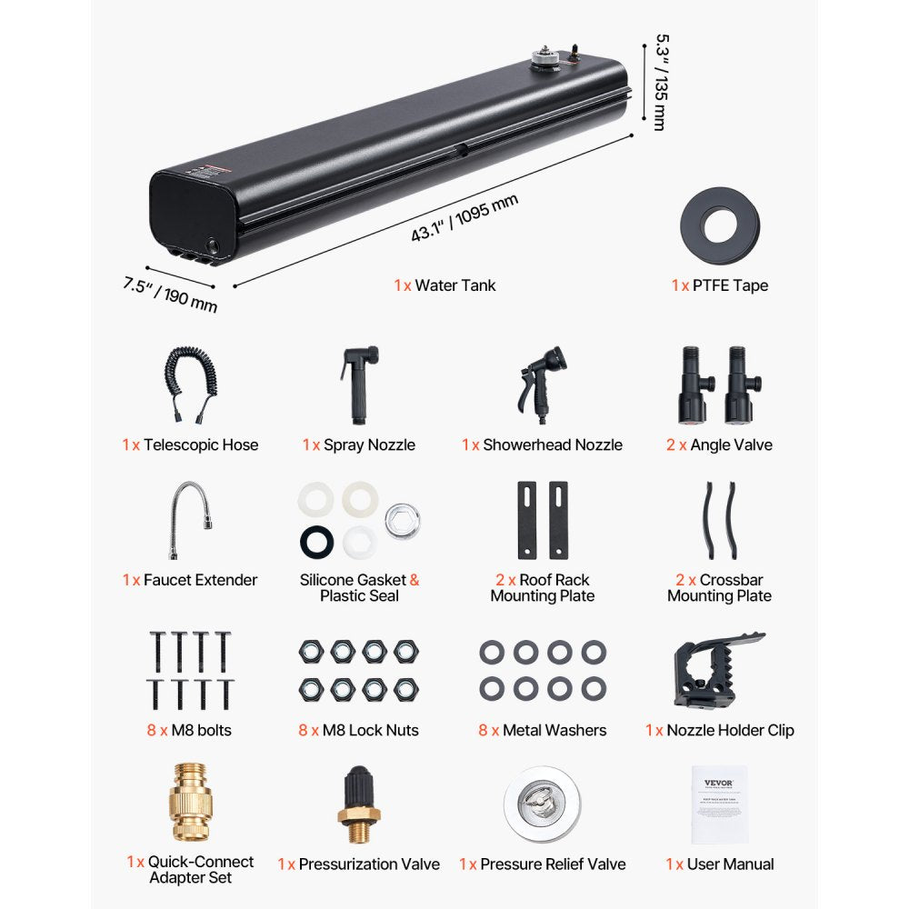 Upgrade your outdoor adventures with the VEVOR 4.5 Gallon Roof Rack Water Tank. Designed for convenience and durability, this portable tank delivers pressurized water on demand — perfect for showers, washing gear, or campsite cleaning. Easy to install and built with a splash-guard panel, it's the ideal companion for any journey.