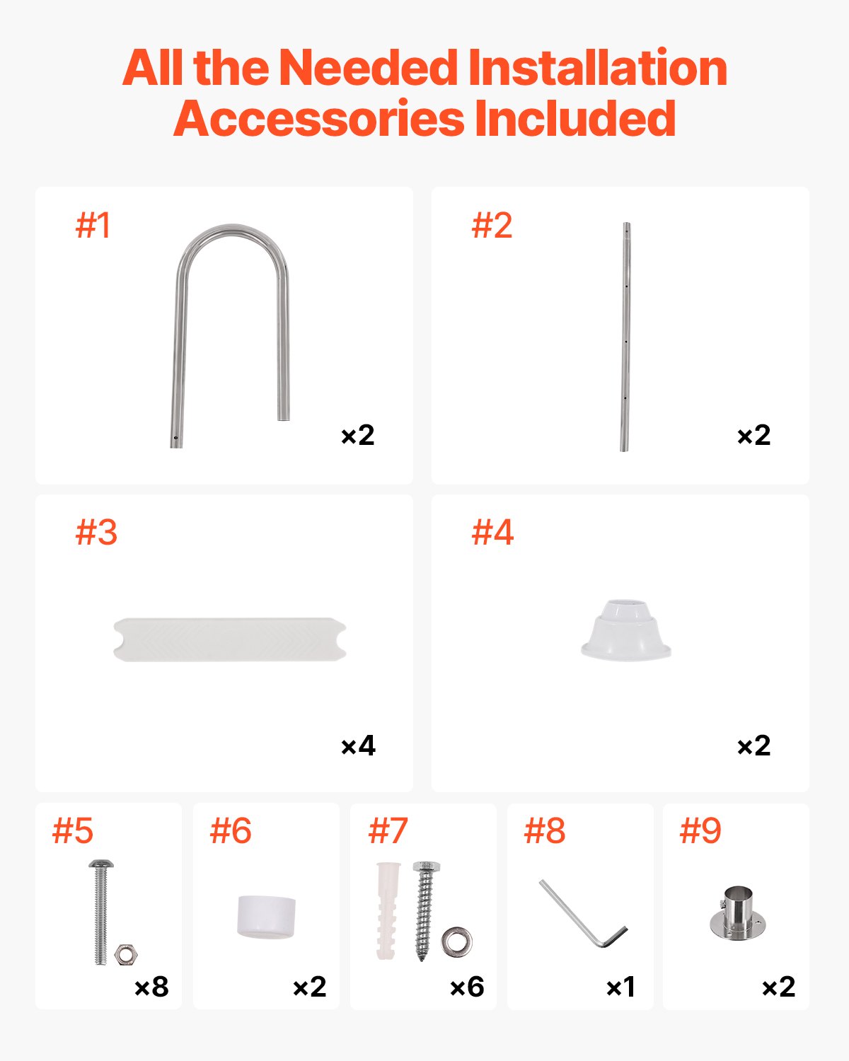 Step into your pool safely and comfortably with the VEVOR 4-Step Stainless Steel Pool Ladder. Designed for 54-inch decked pools, this ladder features two ergonomic handrails and four wide, anti-slip steps, offering excellent grip and stability. Constructed from rust-resistant 304 stainless steel and durable PP, it’s built to handle both indoor and outdoor use. Whether for home or commercial pools, this ladder ensures easy access with a sleek, user-friendly design.