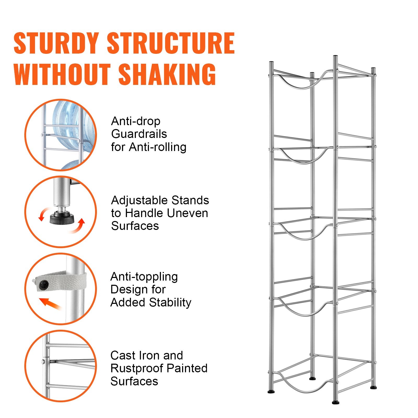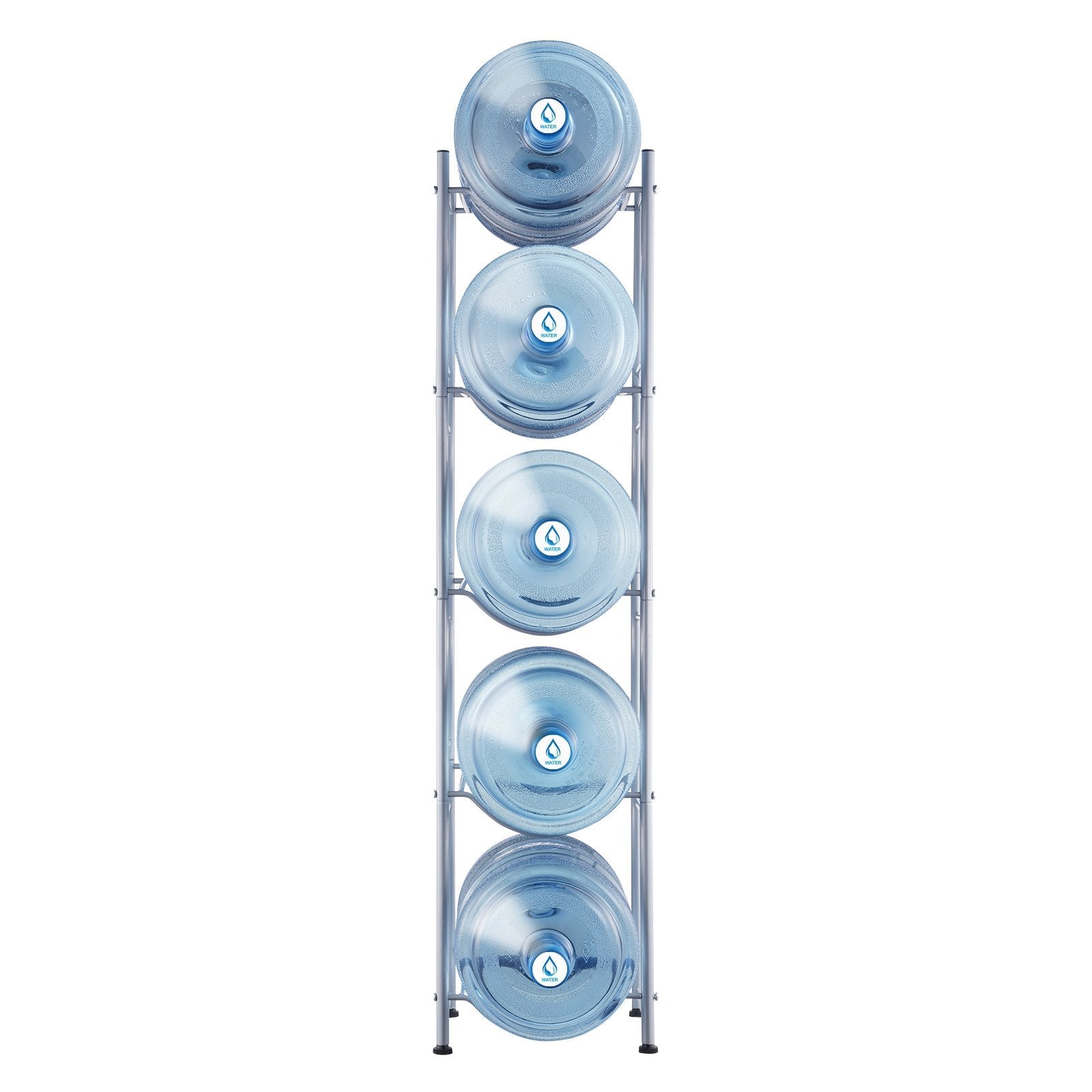 Maximize your storage efficiency with the VEVOR 5-Tier Single Row Water Jug Holder. Designed to hold up to 5 large water bottles, this silver-finished rack offers a practical and durable solution for organizing your home, office, gym, or warehouse. Made from strong iron material, it boasts a high load capacity of up to 209.4 lbs, ensuring stability and durability. Its vertical, multi-tier design saves valuable floor space while keeping your bottles easy to access. Quick to assemble and featuring thoughtful, stability-focused details, this rack helps keep your space neat and safe.