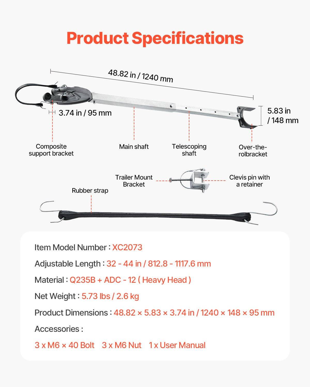 The VEVOR Adjustable Transom Saver is designed to provide superior support and protection to your boat's transom during transport. Featuring a durable and rust-proof construction, this transom saver is built to withstand harsh marine conditions. Its adjustable length (32-44 inches) ensures compatibility with a wide range of boat sizes, while the heavy-duty head provides enhanced stability and load-bearing capacity. Easy to install and maintain, this transom saver ensures your boat's transom stays secure and undamaged during transit.