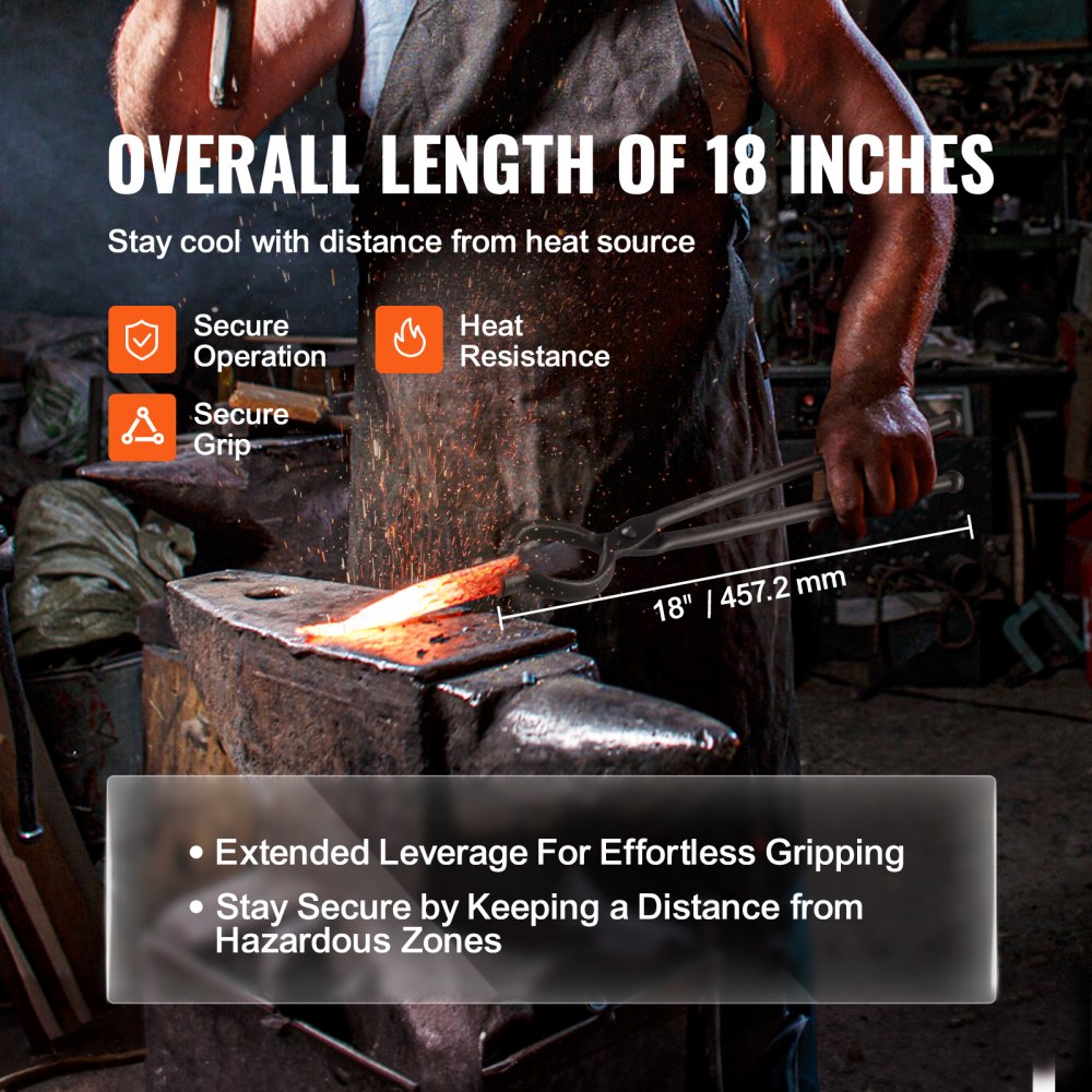 The VEVOR Blacksmith Tongs Set includes three essential jaw styles—V-Bit Bolt Tongs, Wolf Jaw Tongs, and Z V-Bit Tongs—crafted for both beginners and experienced blacksmiths. Each tong features a durable carbon steel build with A3 steel rivets for enhanced toughness and longevity. The 18-inch extended handles offer superior grip, leverage, and safety when forging. Whether you're bladesmithing, metalworking, or doing general forge work, this versatile tong set is a must-have addition to your toolkit.