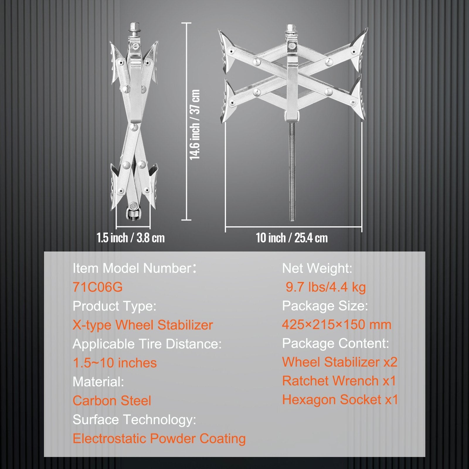Ensure a stable and secure camping experience with the VEVOR Camper Wheel Chock Stabilizer. Designed for RVs, travel trailers, and trucks, this X-shaped wheel chock stabilizer fits tire spaces ranging from 1.5" to 10" in diameter. The set includes two stabilizers, a ratchet wrench for easy adjustment, and a convenient storage bag. Made from durable carbon steel with electrostatic powder coating, these stabilizers are built to withstand the elements. Easy to install in just 5 minutes, they provide quick and effective stabilization to keep your RV or trailer secure while parked.