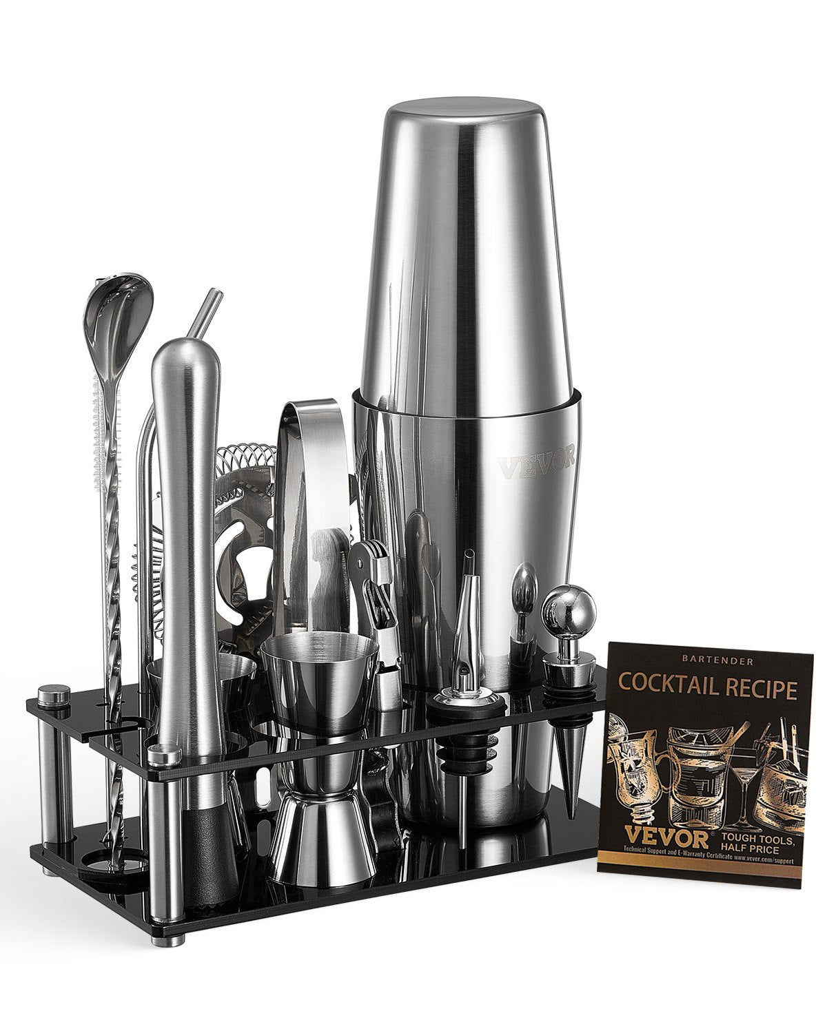 Elevate your home bar experience with the VEVOR Cocktail Shaker Set, a 14-piece professional bartender kit crafted for both beginners and seasoned mixologists. Made from high-quality 304 stainless steel in a sleek silver finish, this set includes all the essential bar tools you need to mix, shake, and pour perfect cocktails with ease. From classic martinis to modern craft concoctions, this kit lets you explore a wide variety of drinks with confidence. The set is neatly organized in a stylish black wooden stand that adds a touch of sophistication to any bar or countertop. Easy to use and clean, this bartender kit is not only functional but also a great way to showcase your personal style and hospitality. Whether you're hosting parties, entertaining guests, or simply enjoying a drink at home, this cocktail shaker set is perfect for all occasions. With compact dimensions and a total weight of just 2.2 lbs, it's also a great gift for cocktail enthusiasts and aspiring bartenders.