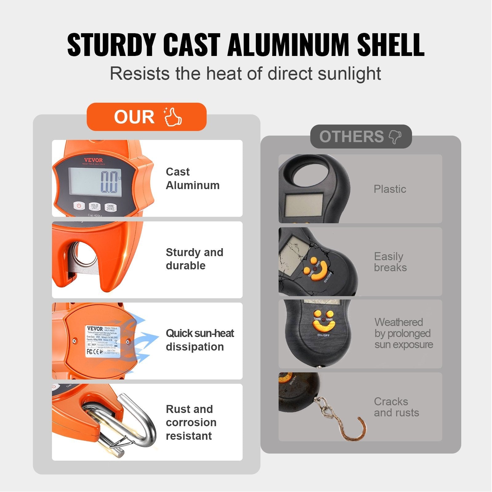 The VEVOR Digital Crane Scale is a rugged, high-precision hanging scale designed for industrial and outdoor weighing needs. With a 400 kg/880 lb capacity and a cast aluminum body, it’s ideal for farming, hunting, fishing, or garage use. The easy-to-read LCD screen, multiple unit conversions (lb/kg/N), and compact handheld design make this a reliable and versatile weighing tool on the go.
