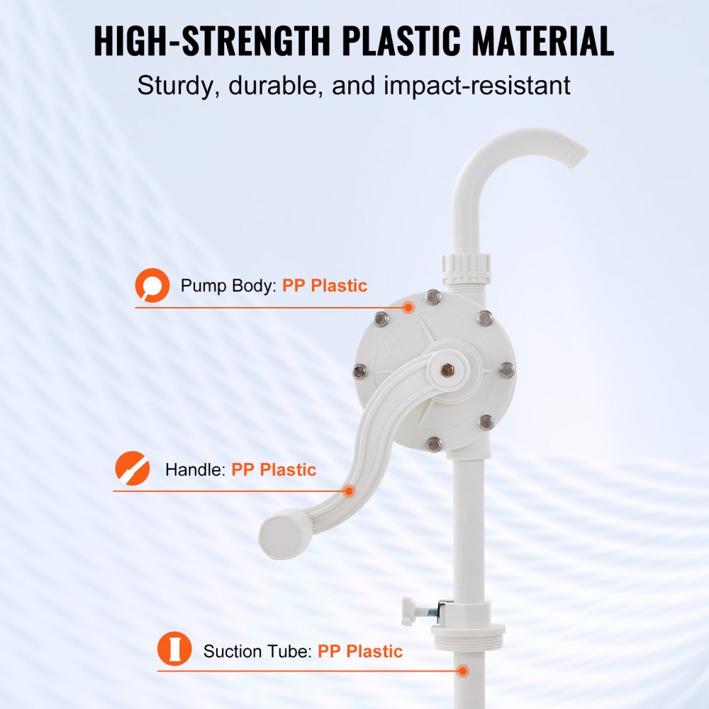 The VEVOR Drum Pump is designed for quick, efficient transfer of liquids from 5 to 55-gallon drums. Featuring a hand-operated rotary crank and a 3-section suction tube, this pump easily handles water, alcohol, and many corrosive liquids. Its durable plastic construction ensures longevity and reliable performance, while the 1-inch outlet tube allows for steady, controlled flow.