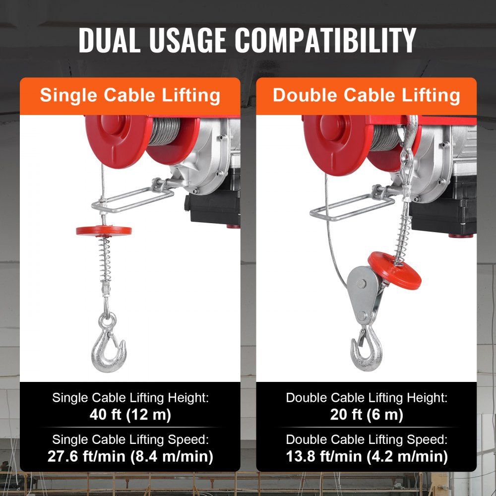 Elevate your lifting tasks with the VEVOR Electric Hoist Crane Winch. With a load capacity of 1320 lbs (600 kg) and an impressive lifting height of up to 328 ft (100 m), this hoist is built for both strength and versatility. Featuring both wireless and wired dual control modes, it ensures ease of use in any environment. Its anti-tipping design guarantees stable operation, while single and double cable lifting options offer flexibility for different lifting heights and speeds. Perfect for garages, workshops, warehouses, or industrial settings, this hoist provides smooth, efficient, and safe lifting.