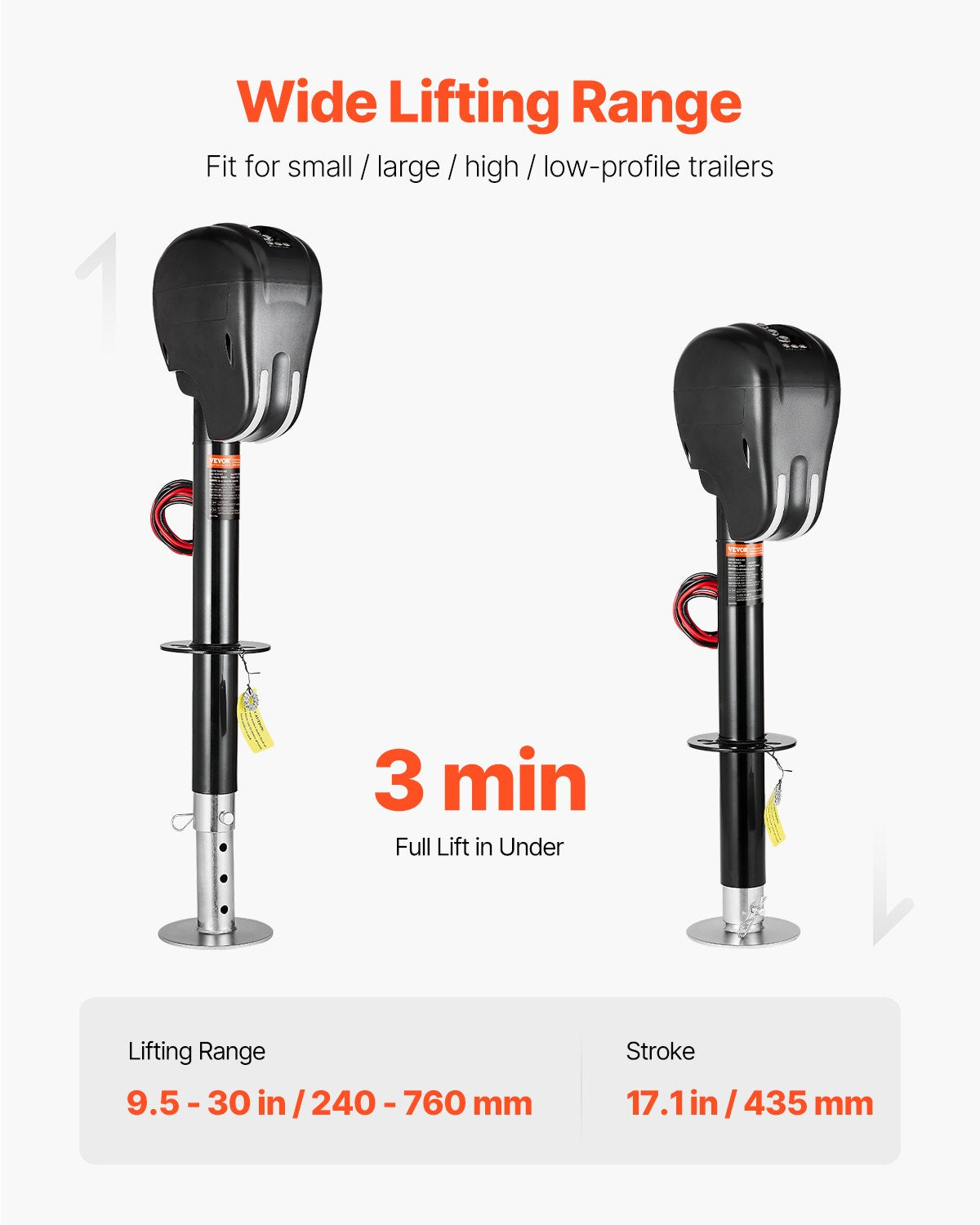Make hitching and leveling your RV, trailer, or camper a breeze with the VEVOR 3500 lbs Electric Trailer Jack. Built with durable carbon steel and powered by a 350W motor, this power tongue jack offers a lifting range of 9.5 to 30 inches and a stroke of 17.1 inches for easy height adjustments. Designed for convenience and reliability, it features user-friendly controls and an emergency handle for manual operation when needed.