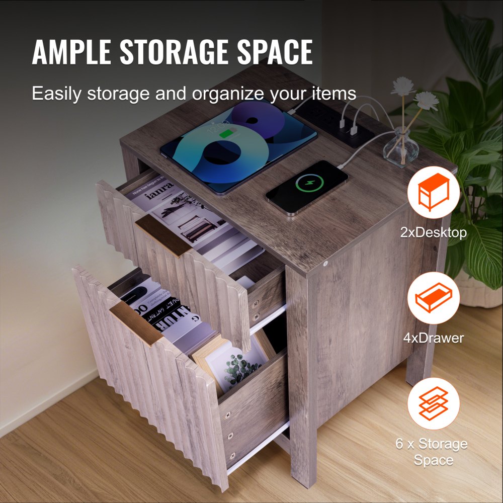 Upgrade your home with the VEVOR Farmhouse End Table Square Night Stand Set of 2. These multifunctional tables blend modern style with practical features like built-in power strips, USB ports, and ample storage. Each nightstand is equipped with 2 AC outlets, 2 USB ports, and 1 Type-C port for easy charging, making them ideal for bedrooms, living rooms, or home offices. With two drawers and three storage layers, these gray panel-style nightstands provide versatile organization in a sleek, space-saving design.