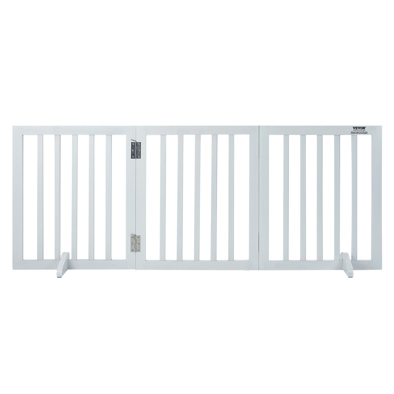 Create a stylish and secure indoor space for your pets with the VEVOR Free Standing Dog Gate. Featuring a modern white finish and three foldable panels, this 24" tall gate extends up to 60" wide to suit both wide and narrow entryways. The sturdy construction includes silent foot supports for enhanced stability without scuffs or noise, while the waterproof finish resists everyday wear. Ideal for use in hallways, doorways, or open floor plans, this freestanding dog barrier offers a blend of functionality and modern design without the need for wall installation.