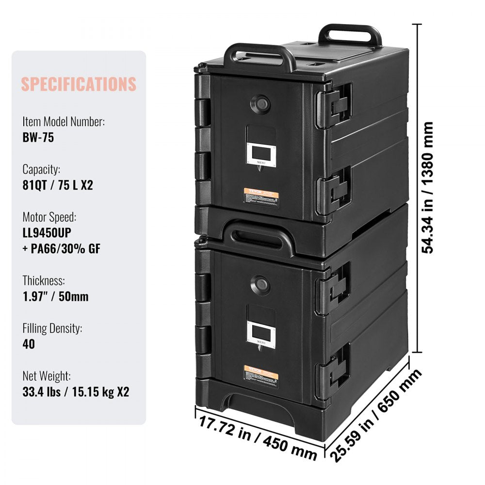 The VEVOR Insulated Food Pan Carrier is the ideal solution for catering, buffet services, or food transport, offering reliable insulation to keep food hot or cold. With a large capacity of 81QT (75 L) per box, this stackable catering dishbox is designed for efficiency and convenience. Whether you're serving warm dishes or chilled items, this food carrier ensures your food maintains the ideal temperature for extended periods. Built with durable LL9450UP and PA66/30% GF materials, the carrier features a thickness of 1.97" (50mm) for superior insulation. Its stackable design allows for easy storage and handling, while the convenient mobility features make transporting large quantities of food a breeze. Whether for events, parties, or food service, this dishbox is designed with user-friendly features for an efficient and hassle-free catering experience.