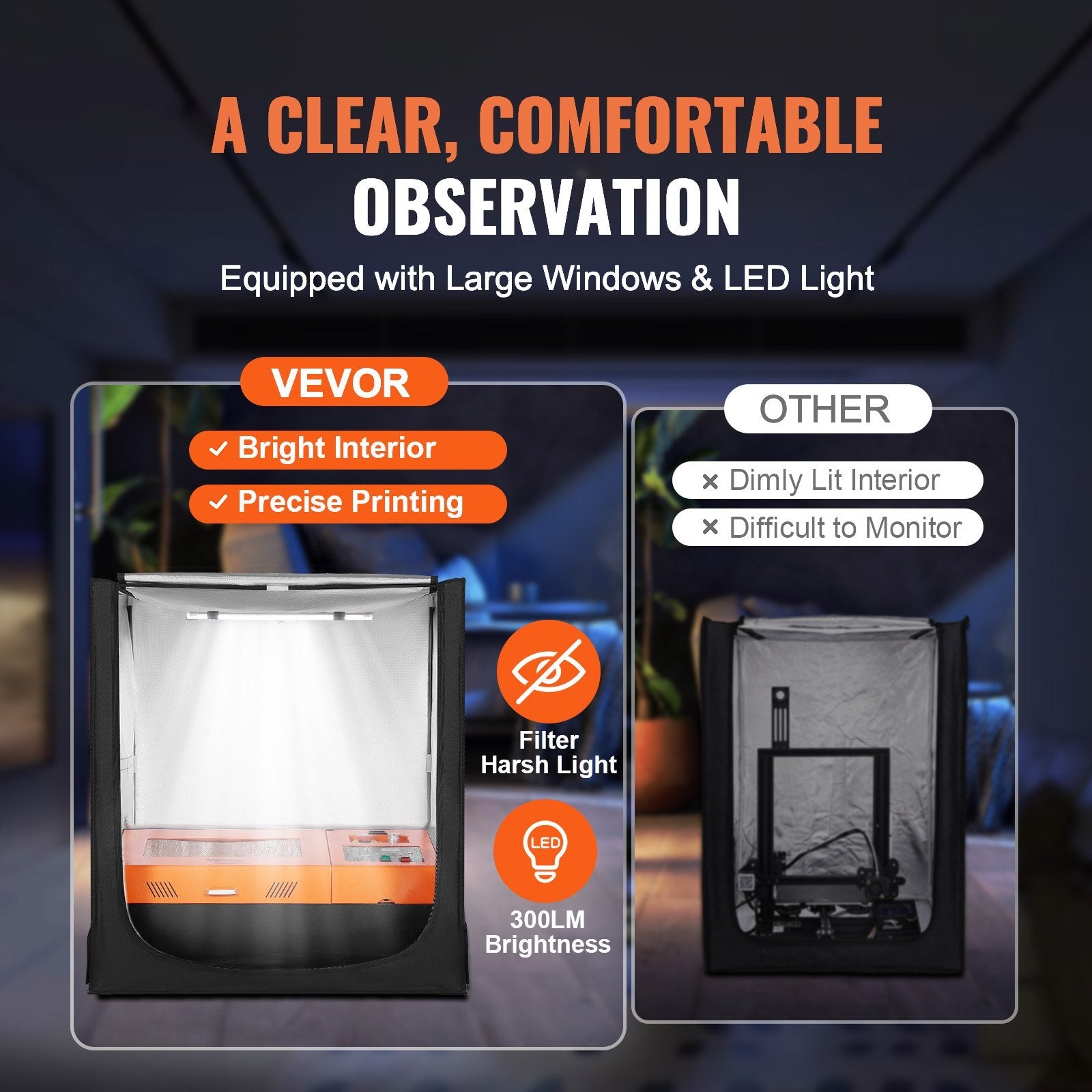 The VEVOR Laser Engraver Enclosure offers a secure, fireproof workspace designed for optimal laser engraving performance and safety. With spacious dimensions and universal compatibility, it accommodates most desktop engravers. The enclosure features a large viewing window, internal LED lighting, dual exhaust ports, and multiple protective elements for safe and efficient operation. Its durable 600D fireproof composite aluminum foil and tawny PVC board ensure heat resistance and containment, making it ideal for home, studio, or workshop use.