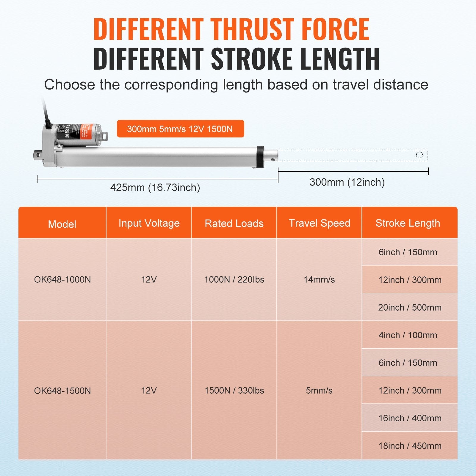 Automate your projects with the VEVOR 12V Linear Actuator, engineered for powerful and precise motion. With a high load capacity of 330 lbs (1500N) and a 12-inch stroke, this actuator is perfect for applications like furniture automation, industrial machinery, and home automation systems. Constructed from durable aluminum alloy and rated IP54 for dust and splash resistance, it operates smoothly at a quiet ≤60 dB. Easy to install and compatible with various control systems, this actuator delivers consistent, linear motion with minimal maintenance.