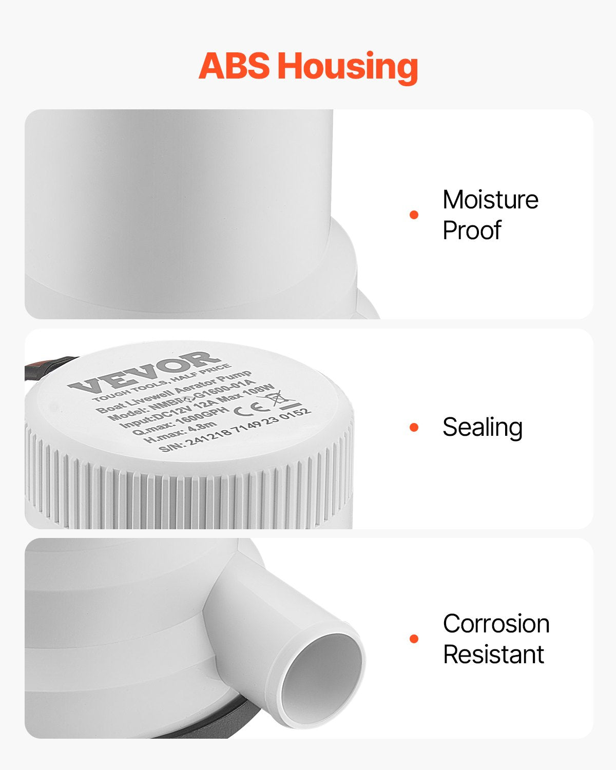 Keep your bait and catch fresh all day with the VEVOR 1600GPH Livewell Pump, engineered for small boats and serious anglers. Delivering powerful oxygenation and water circulation, this compact 12V pump features dual inlets, a high-capacity 1600GPH flow rate, and a waterproof IPX7 rating. Built with a durable ABS housing, it’s designed for easy installation and long-lasting performance in marine environments.