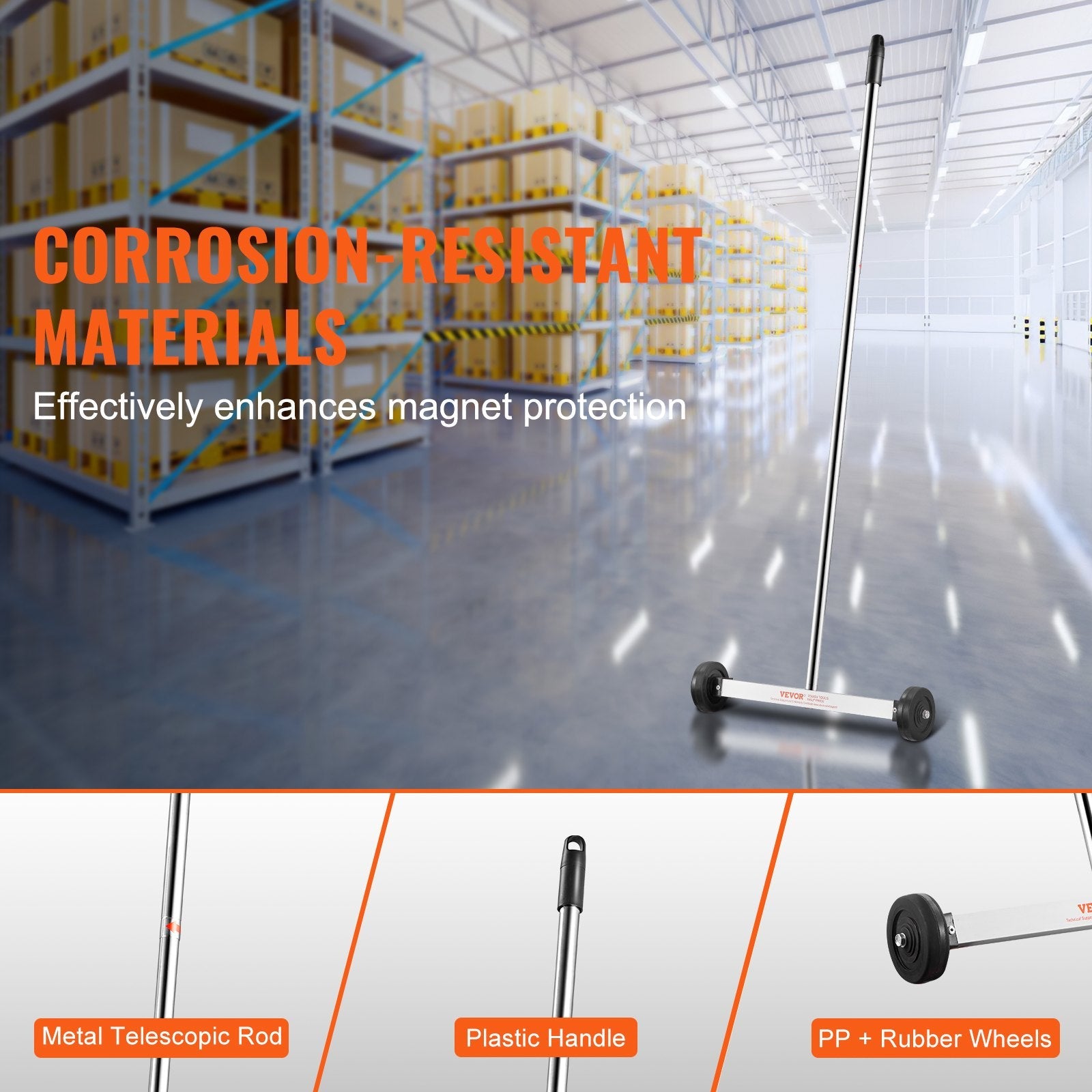 The VEVOR Magnetic Sweeper with Wheels is the ultimate tool for quick and efficient debris cleanup. Designed for both commercial and residential use, this 15-inch mini sweeper combines powerful magnetic force with an adjustable handle for easy use. With a maximum pull force of 8 lbs, it’s perfect for picking up nails, screws, and other metal debris from a variety of surfaces. Its portable design, adjustable telescopic rod, and 2.95-inch wheels make it easy to maneuver around different areas, while its durable construction ensures long-lasting use. Whether you're working in a workshop, construction site, or home garage, this magnetic sweeper is a reliable solution for precision cleaning.
