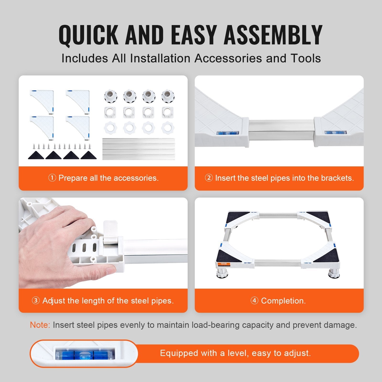 Enhance your laundry room with the VEVOR Mini Fridge Stand Universal Laundry Pedestal. This adjustable pedestal provides a stable, ergonomic solution for your washing machine or dryer, elevating it for easier access and reducing strain. The stand is compatible with most washers and dryers, with an expandable width of 15"-24.2" to fit a variety of models. The four strong feet ensure stability, while the easy-to-install design offers convenience. Made from durable PP and stainless steel, this stand also serves as a thoughtful gift for those looking to improve their laundry experience.