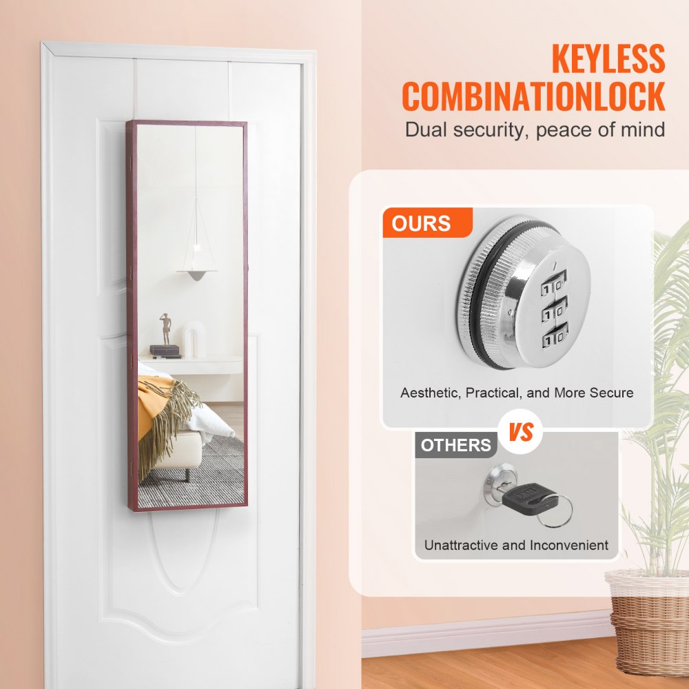 The VEVOR 47.05-inch Mirror Jewelry Cabinet combines elegant design with practical storage, making it an ideal addition to any bedroom or dressing area. Featuring a full-length mirror and a spacious, velvet-lined interior, this wall- or door-mounted armoire keeps your jewelry organized, protected, and easily accessible. With lockable security, built-in LED lighting, and thoughtfully arranged compartments for rings, necklaces, earrings, and cosmetics, this cabinet offers style and function in one. It’s easy to install and makes a perfect gift for loved ones who appreciate organization and elegance.