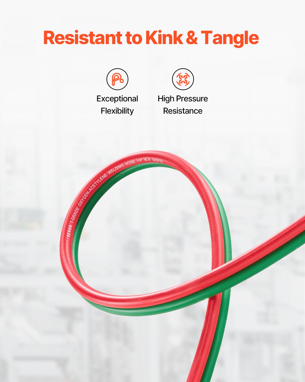 Ensure safety and durability with the VEVOR Oxygen Acetylene Hose, designed for welding and cutting operations. This high-quality T-Grade hose offers exceptional pressure resistance and is built to withstand the demands of both industrial and DIY projects. With a clear color-coding system, it easily distinguishes between oxygen and acetylene hoses, ensuring proper connections. The hose features a 300 PSI working pressure and a robust construction that can handle high pressures up to 900 PSI. Perfect for various applications, from welding to brazing, this 15-foot hose is compatible with a range of gases and comes equipped with type B fittings for secure and reliable connections.
