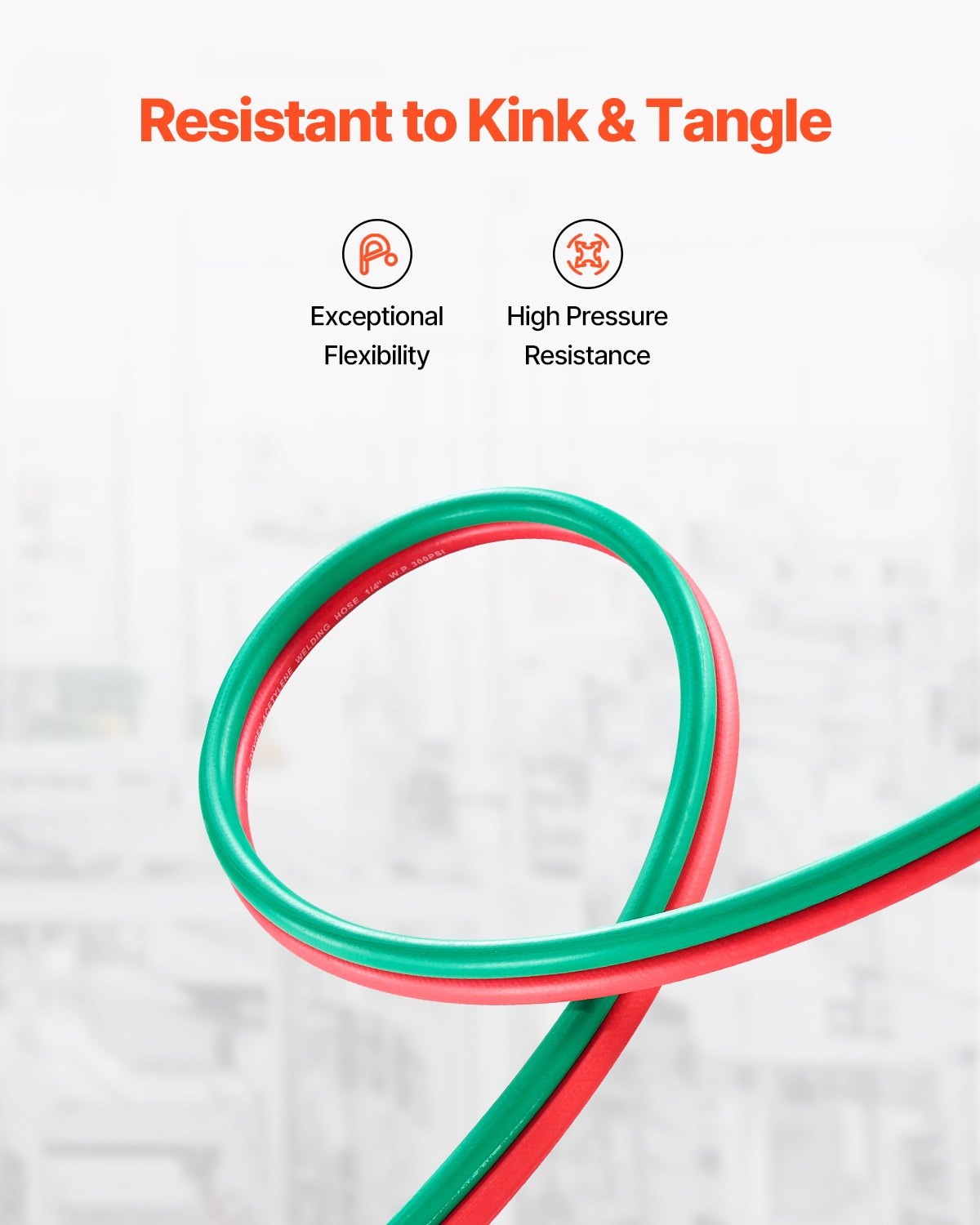 The VEVOR Oxygen Acetylene Hose offers superior performance and safety for all your welding and cutting tasks. This 50-foot R-Grade hose provides high-pressure resistance with a working pressure of 300 PSI and a bursting pressure of up to 900 PSI. Designed with a durable construction, this hose ensures longevity and reliability in even the most demanding environments. Its clear color-coding system helps prevent mixing up oxygen and acetylene hoses, ensuring safety during use. The hose is suitable for a wide range of applications, from welding to brazing, and is compatible with oxygen and acetylene gases. Equipped with type B fittings, this hose guarantees secure and stable connections.