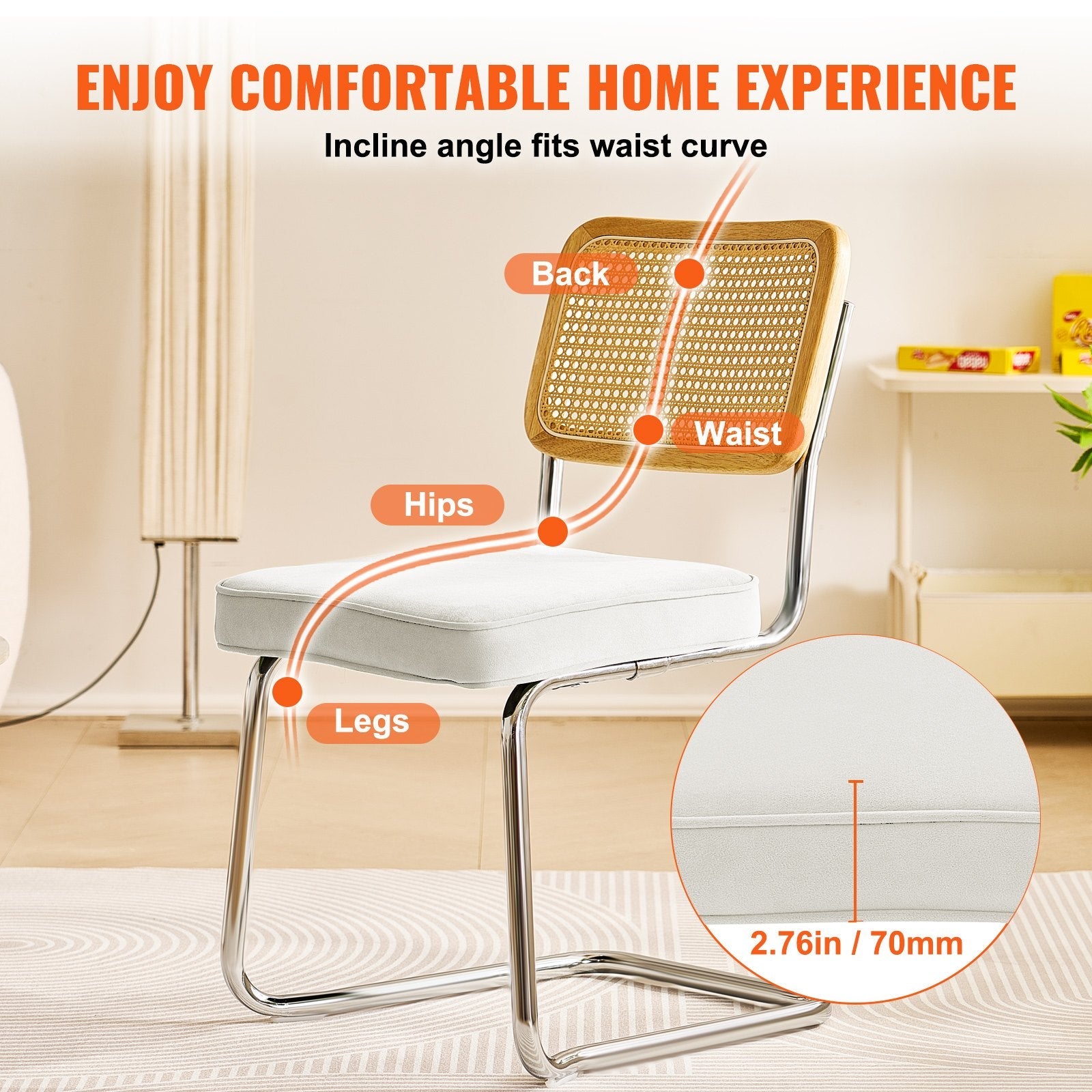 Add a touch of refined retro style to your space with the VEVOR Set of 2 Rattan Chairs in elegant white. These mid-century modern dining chairs feature a soft velvet seat cushion, natural rattan backrest, and a sturdy cantilever metal frame. The clean white color complements any décor, making these chairs perfect for dining rooms, bedrooms, reading nooks, or offices. Designed for comfort, style, and versatility, this set delivers cozy seating with effortless elegance.