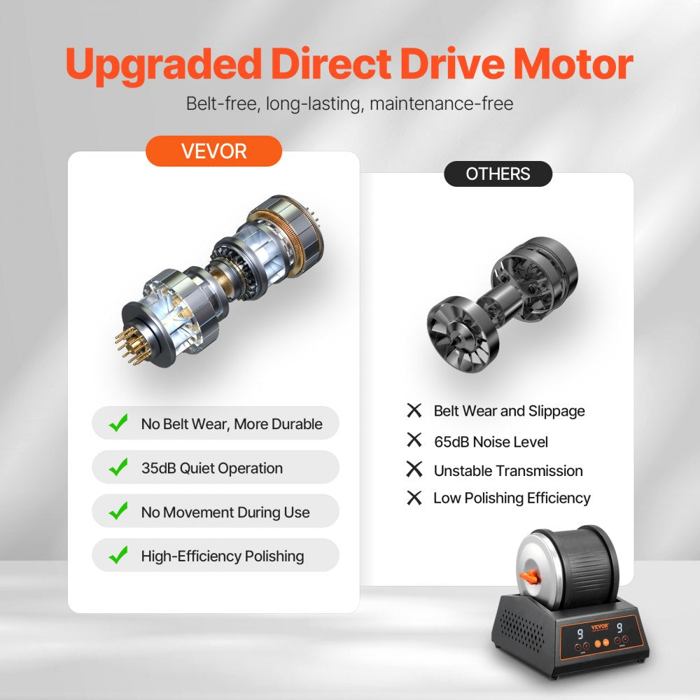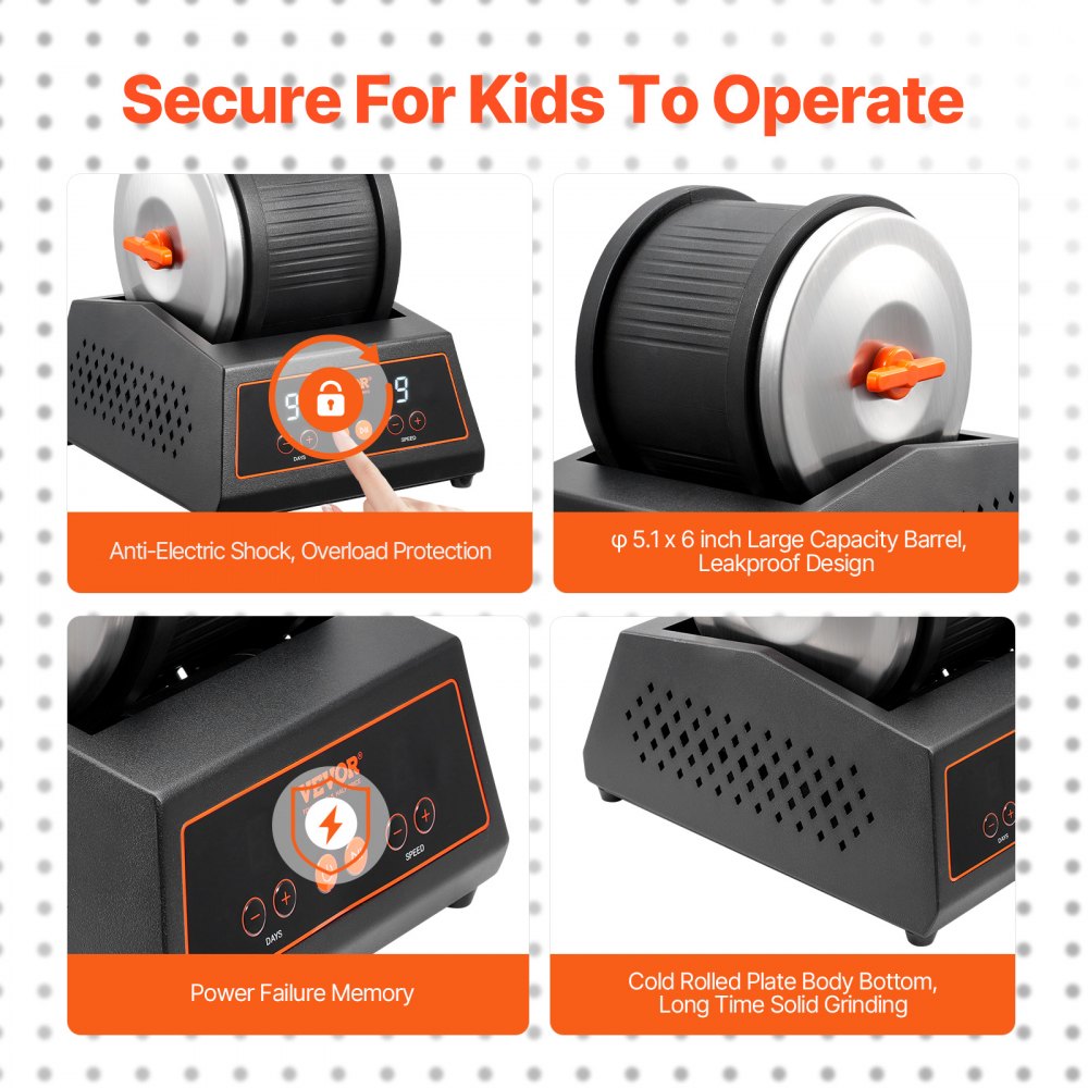 The VEVOR Rock Tumbler Machine is an efficient and durable polishing tool designed for rock enthusiasts and beginners alike. With a 4 lbs capacity and belt-free operation, this rock polishing kit offers lasting performance and silent operation, making it ideal for smooth, efficient polishing. Featuring 9 adjustable speed settings and a 9-day timer, it provides complete control over your polishing process, ensuring perfect results every time. The user-friendly design allows for easy setup in just 4 simple steps, making it an excellent choice for beginners looking to create polished rocks or gemstones.