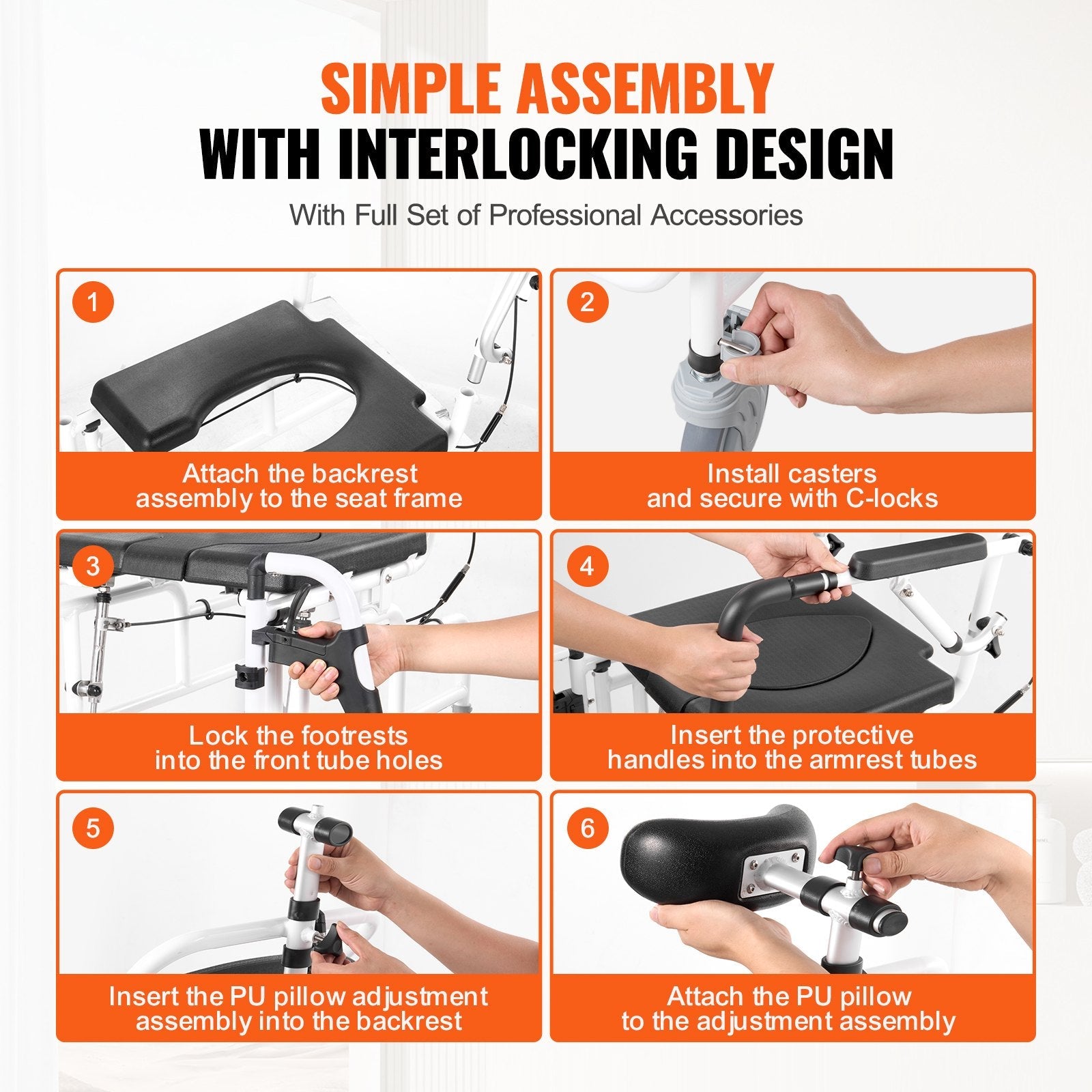 Ensure safe, dignified, and comfortable bathing with the VEVOR Shower Wheelchair, designed to support adults with limited mobility. Crafted from rust-resistant aluminum alloy and equipped with a padded PU seat, this multifunctional chair serves as a shower wheelchair, commode chair, and transport chair. With a 17.5-inch wide seat, it provides accessible hygiene support and smooth maneuverability in tight bathroom spaces—perfect for disabled or elderly users and caregivers alike.