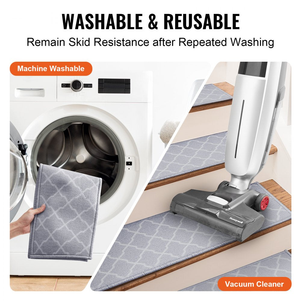 The VEVOR Stair Treads provide a safe, stylish, and comfortable solution for protecting your stairs. This set includes 15 light gray non-slip stair rugs, each measuring 9" x 28", designed for indoor wooden steps. Made from soft yet durable polypropylene fiber with a non-slip TPE backing, they stay securely in place without sticky glue. These treads are ideal for households with kids, elders, or pets, offering added traction, noise reduction, and stair protection. Machine washable for easy care and designed for hassle-free installation on various surfaces.