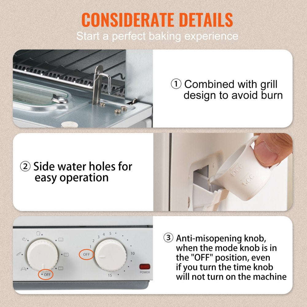 Upgrade your kitchen with the VEVOR 12L Steam Oven Toaster, a compact and versatile 5-in-1 countertop appliance that delivers healthier, faster cooking. With 7 cooking modes including steam baking, air frying, grilling, and toasting, this convection oven is perfect for everything from crispy pizza to soft, steamed bread. The powerful 1300W motor ensures even heat distribution, while the 2-knob control makes operation simple and intuitive. Its sleek design and easy-clean features make it ideal for modern kitchens.