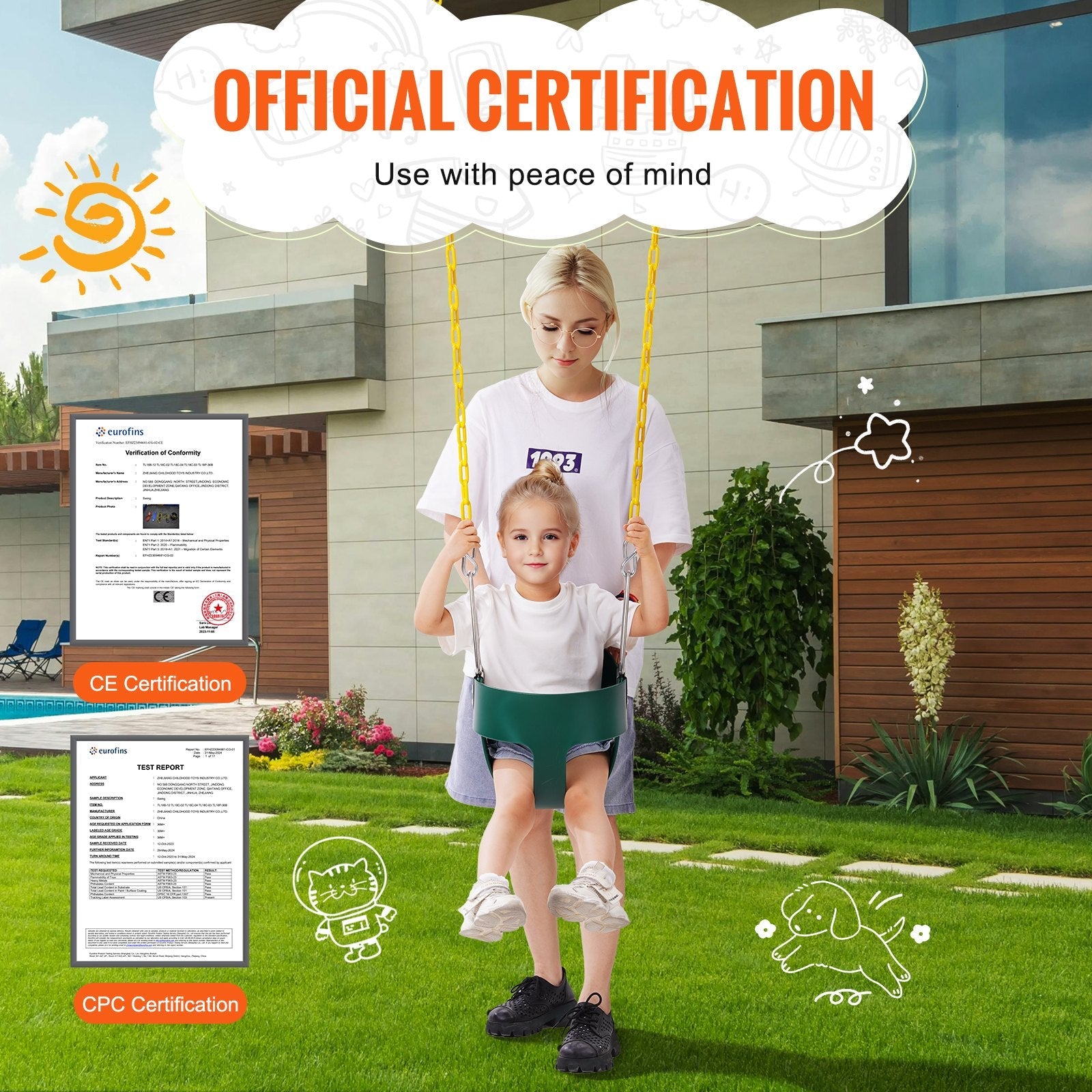 Keep your little ones safe and smiling with the VEVOR Toddler Swing Seat. Designed with a high back full-bucket structure, this swing provides enhanced support and security for toddlers aged 36 months and up. Crafted from durable EVA material and equipped with galvanized iron chains, it ensures long-lasting use both indoors and outdoors. The heavy-duty design supports up to 150 lbs, while safety lock features and a stable structure make it a worry-free addition to your play area. Perfect for backyards, playgrounds, or playrooms—fun and safety come together with this toddler swing seat.