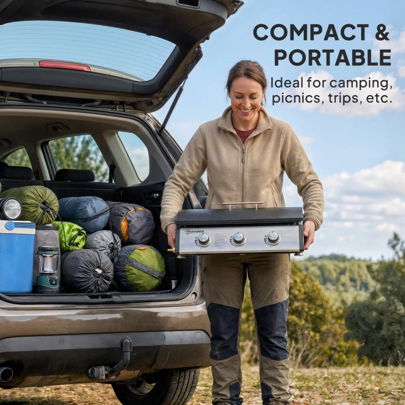 Cook anywhere with confidence using this 3-Burner Propane Gas Griddle Grill by Outsunny. Designed for versatility and portability, this compact gas plancha features three independent burners, a non-stick cooking surface, and a heat-locking lid β perfect for camping, tailgating, festivals, and backyard gatherings.